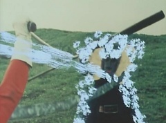 Boat Ear Mask had kidnaped Professor Kudo. Boat Ear Mask wanted pull out Professor Kudo's memories for the formula for minus energy. Aka Ranger and Momo Ranger rescued Professor Kudo. Momo Ranger got Professor Kudo to where Variblune was hovering. The cage is lowered. Momo Ranger grabs onto the cage and gently places Professor Kudo underneath it. Professor Kudo shoots up the tube and into Variblune. Variblune flies away. Meanwhile, Aka Ranger is battling Boat Ear Mask. Boat Ear Mask charges towards Aka Ranger with his sword. The two fight, with Aka Ranger blocking most of Boat Ear Mask's moves. Aka Ranger pulls out his Red Vute and quickly wraps it around Boat Ear Mask's neck. Aka Ranger then uses his Red Vute to wrap around Boat Ear Mask's weapon. Boat Ear Mask holds tight onto his weapon. Boat Ear Mask uses his ribbon to knock Aka Ranger off his feet. Aka Ranger struggles to remove the ribbon from his neck. He also has not loosen his grip on Red Vute. Aka Ranger uses Red Spark. An electric charge emits from Aka Ranger's suit onto Boat Ear Mask. It's Red Ranger's Ultra C attack. The ribbon is released from Aka Ranger. Ki Ranger and Ao Ranger fly out of Variblune with the use of their Birdies. The two land close to where Aka Ranger and Boat Ear Mask are fighting. Boat Ear Mask is furious as the four Gorengers make their presence known. But Boat Ear Mask quickly taunts them that their 5th member didn't show up and laughs. Mido Ranger shouts, turn around! The five Gorengers face down Boat Ear Mask. Boat Ear Mask summons the Zolders and has them attack. Momo Ranger fights a Zolder with quick moves. Ki Ranger lands a powerful chop against a Zolder. Aka Ranger lands several punches against a Zolder. Mido Ranger fights a Zolder using his Midomerang against it. Mido Ranger struggles a little with his injured arm. Ao Ranger lands a kick against a Zolder. Ki Ranger head butts a Zolder and then tosses it. Mido Ranger uses his Midomerang against the same Zolder and knocks it out. Aka Ranger uses his Red Vute against several Zolders. Momo Ranger fights a pair of Zolders and knocks them aside. She takes her Earrings Bomb and tosses towards a group of Zolders racing towards her. Ao Ranger uses his Blue Cherry and shoots a Zolder above him. Mido Ranger fights three Zolders using his Midomerang. After defeating them, Mido Ranger challenges Boat Ear Mask. Boat Ear Mask responds by telling him, come at me! Boat Ear Mask uses his reverse strike but misses Mido Ranger. Boat Ear Mask releases his ribbon but Mido Ranger cuts it with his Midomerang. Mido Ranger tells Boat Ear Mask, he is going to get his ears next. Mido Ranger leaps high into the air and lands close to Boat Ear Mask. Mido Ranger uses his Midomerang and cuts off Boat Ear Mask's ears. The ears land on the ground and then reassemble onto Boat Ear Mask's weapon. Boat Ear Mask fights Mido Ranger with his weapon. Mido Ranger leaps out of the way and lands close to the rest of the Gorengers. The Gorengers summon Gorenger Storm. Boat Ear Mask runs towards them with his weapon. Momo Ranger has a pink ball and kicks it towards Ki Ranger. Ki Ranger head butts the yellow ball towards Ao Ranger. Ao Ranger kicks the blue ball over to Mido Ranger. Mido Ranger kicks the green ball over to Aka Ranger. The ball turns red and spikey on it's way towards Aka Ranger. Aka Ranger leaps up and kicks the ball towards Boat Ear Mask. Gorenger Storm strikes and destroys Boat Ear Mask.