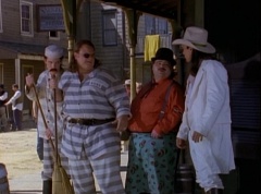 One-Eyed Bulk and Doc Skullovitch are cleaning up the front of Ernest's place as part of their prison program. Ernst walks out with the White Stranger and thanks him for recapturing these rascals. White Stranger replies, all in a day's work and walks away.