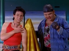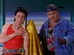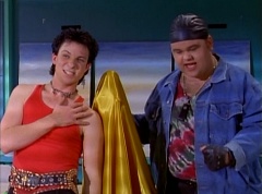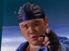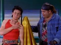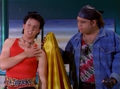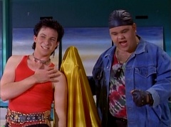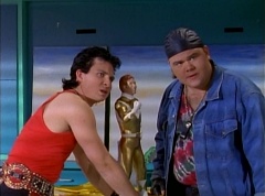 Skull and Bulk applaud Violet. Ms. Binx remarks, oh really? Name two? Skull replies, Bulk and Skull. Ms. Binx can only shake her head. Bulk continues, this statue will sit proudly in town square and the Power Rangers themselves, will appear and thank us for our vision. Bulk pulls the cloth off the statue. The statue is dressed in a gold Mighty Morphin costume and looks a lot like Billy. Violet asks Billy if he likes it? Billy is stunned and doesn't know what to say. Skull and Bulk are stunned as well. Bulk asks Violet, what is this suppose to be?