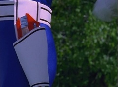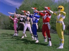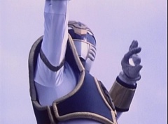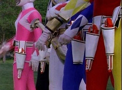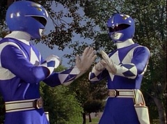 Kimberly glances down at the grass and spots Billy's holographic disc. She picks it up and holds it up in the air. Kimberly asks the Blue Rangers what is this? Evil Blue Ranger replies a mirror. Kimberly replies, wrong, it's a hologram. She has figured out which is the real Blue Ranger. Rocky, Aisha, Tommy, Kimberly, and Adam morph. The real Blue Ranger joins them as they face down evil Blue Ranger. The Rangers blast evil Blue Ranger with their Blade Blasters and he is quickly destroyed.