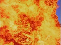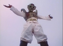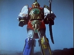 Vase Face grows to giant size. The Rangers summon their zords. Thunder Megazord is formed. White Tiger Zord transforms into warrior mode. Vase Face charges towards Thunder Megazord and Tiger Zord.