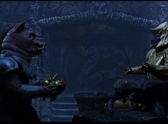 At the Moon Palace, Goldar is enjoying sitting on the throne. Mordant bows down to him as Goldar declares that he is King Goldar, the Ruler of the Universe! The doors open and it is Rita Repulsa and Lord Zedd. Goldar and Mordant know they are in trouble.