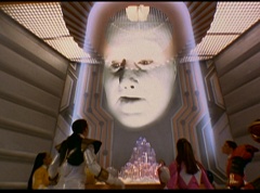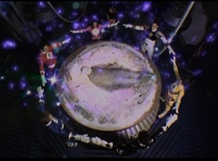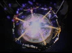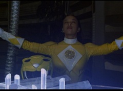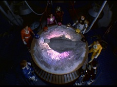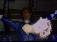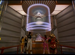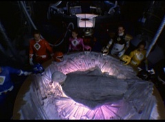 The Rangers form a circle around Zordon's tube. They hold up their hands and their fingertips touch each other. The Great Power emits from their animal spirits and surrounds Zordon and the Command Center. The Command Center repairs itself. The Great Power enters Zordon and with a deep gasp, Zordon is alive. Zordon's tube repairs itself.