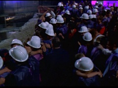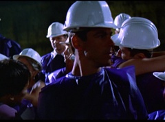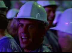 The destruction of Ivan Ooze breaks the spell the parents were under. Most of them are bewildered as water sprays on them. Fred notices and turns off the water. The parents are still confused but happy to see their kids. Bulk wants to give Skull a hug, but Skull insists on a handshake. Fred scans the crowd for his father. He spots him and calls out to his dad. Fred's dad hurries over to him and helps him out of the bucket. They hug each other.