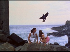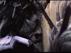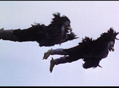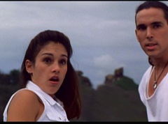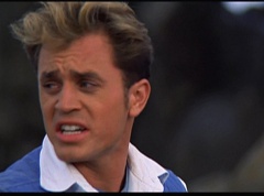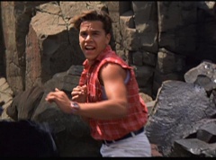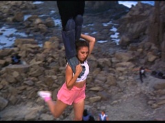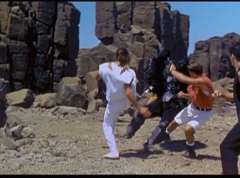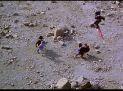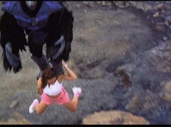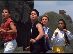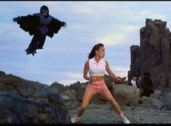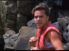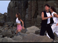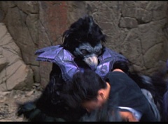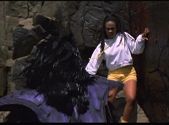 Kimberly feels a little better and they turn to join their friends when suddenly a Tenga Warrior flies straight at them. They quickly duck down. Rocky, Adam, Billy, and Aisha get into a fight stance as four Tenga Warriors head for them. They all duck down as well. The Tenga Warrior comes back around for Tommy and Kimberly and they jump out of the way. The rest of the Tenga Warriors are flying all around Aisha, Rocky, Billy, and Adam. Kimberly and Tommy join their friends. As the Tenga Warriors continue to fly towards them, the teens take cover. Rocky and Kimberly kick two of the Tenga Warriors away. Aisha gives a Tenga Warrior a strong kick. Billy flips over a Tenga Warrior headed his way, which causes the Tenga Warrior to crash into a wall of rock. Billy notes you don't appreciate morphing until you can't do it. A Tenga Warrior knocks Billy aside. Another one knocks Rocky aside as well. Kimberly fights a Tenga Warrior unaware there is one behind her. The Tenga Warrior hooks his claws into her shoulders and lifts Kimberly off the ground, flying away with her. A couple of Tenga Warriors knock Tommy to the ground. Kimberly screams for help.