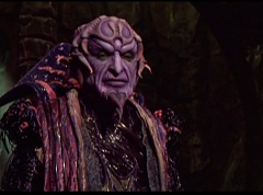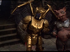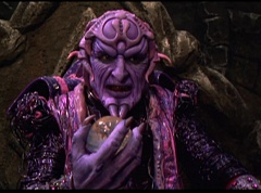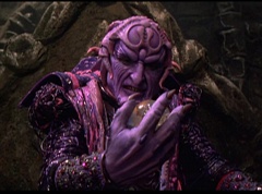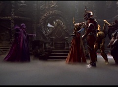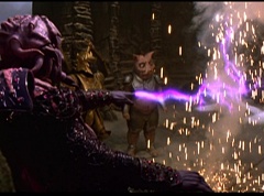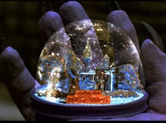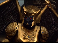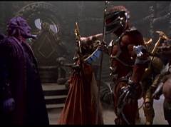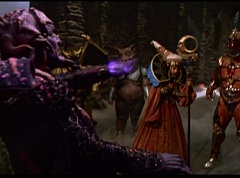 Ivan Ooze shoots out some slime which seals Rita's mouth close. Lord Zedd is happy - finally someone shut her up! Rita tries to remove the slime, and it shock her. Ivan Ooze tells them, you feebleness is staggering. You obviously need a vacation. I think circumstances force us to choose a new leader, and I pick...me! Ivan Ooze laughs. Lord Zedd becomes angry, who does this clown think he's dealing with? Ivan Ooze sits on Lord Zedd's throne and tells them the bogeyman is taking over. Lord Zedd is furious - no one double-crosses Lord Zedd and lives! Lord Zedd uses his staff to direct power to destroy Ivan Ooze. Instead it makes him laugh. Ivan Ooze then uses his power to place Rita Repulsa and Lord Zedd inside a snow globe. Ivan Ooze gives it a good shake. Ivan Ooze tells Mordant and Goldar they have a choice. You either serve me, or you can join these insufferable dingledorks! Lord Zedd demands that Goldar gets them out of there and not to listen to Ooze. Instead Goldar gives his alliance to Ivan Ooze, as does Mordant. Goldar asks what are we going to do about the Power Rangers?