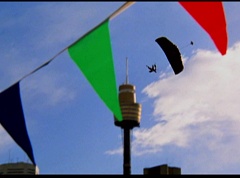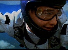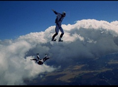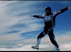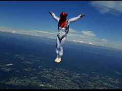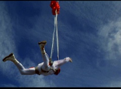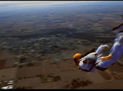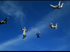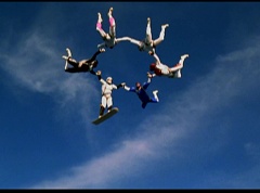 The six friends did several flips and stunts in the air and then they gather together to form a circle. Holding hands, they are laughing and having a great time. After a few moments, the groups breaks apart. As they fall towards the ground, they release their parachutes.