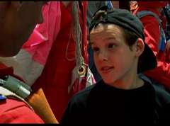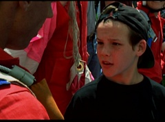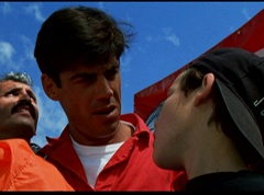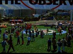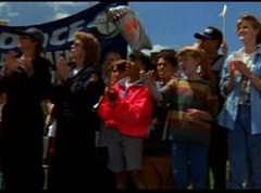 Below at the target sight, the announcer states, with the arrival of Ryan's Comet, just two days away, the Angel Grove Jump-a-thon will breathe new life into the old observatory. Tickets to see the comet are available at the fire fighters booth. A crowd has gathered around the landing area. The announcer announces, raise your eyes to the skies. Now here comes the team from Angel Grove High! The crowd cheers. A young boy, Fred, and his dad are in the crowd cheering. Fred tells his dad, pay close attention. This is how the pros do it. Fred's dad replies that he didn't do so bad. Fred states, you landed in the parking lot. It was embarrassing. The dad isn't too fazed. The pair return to watching the skies. Adam lands first and hits the target dead center. Next is skydiver Billy, who manages a perfect landing.