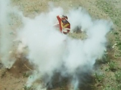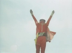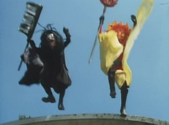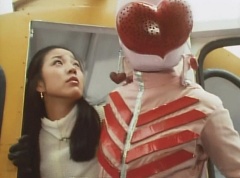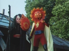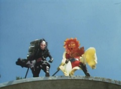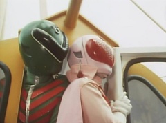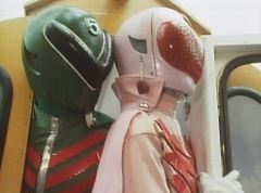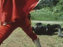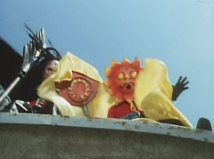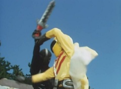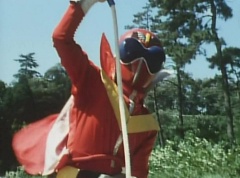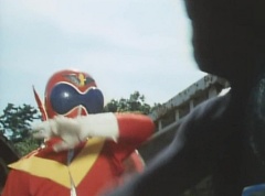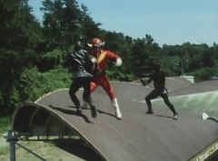 Tsuyoshi fights another batch of Zolders. Sun Halo Mask gives the order to kill all three of them! Tsuyoshi transforms into Aka Ranger. Aka Ranger fights another group of Zolders. Ao Ranger kicks several Zolders. Ki Ranger strikes a Zolder several times. Aka Ranger fights another batch of Zolders. He uses his Red Vute to strike several of them. Sun Halo Mask shouts, time to stop this meaningless fight! Sun Halo Mask shoots his beam towards Aka Ranger. As Aka Ranger avoids being hit, Sun Halo Mask tells Black Hair Mask he is going to the reservoir now.