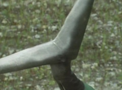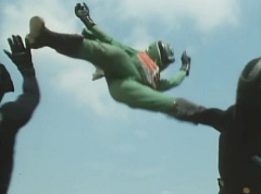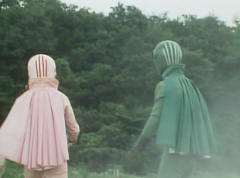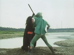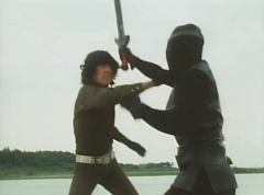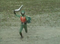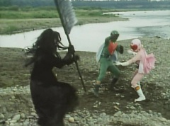 Kenji fights a Zolder. Kenji soon transforms into Mido Ranger. Black Hair Mask fights Mido Ranger with his large comb. Momo Ranger soon joins Mido Ranger in fighting Black Hair Mask. They manage to avoid being hit by the large comb. Mido Ranger manages to land a kick against Black Hair Mask. Mido Ranger leaps away and kicks two Zolders. Momo Ranger uses her Earrings Bomb to get rid of more Zolders. Mido Ranger lands a kick against a Zolder. Black Hair Mask runs up and fights Mido Ranger. Mido Ranger leaps away and uses his Midomerang. The Midomerang hits one of the comb's teeth and knocks it out. Black Hair Mask is very angry that Mido Ranger broke his comb. Momo Ranger comes up behind Black Hair Mask and uses her Earrings Bomb against Black Hair Mask. After the smoke clears, Momo Ranger and Mido Ranger search the area, but they cannot find Black Hair Mask. Momo Ranger informs Mido Ranger the information from 007 is correct. Mido Ranger concludes they will show up at the reservoir next time. They head off to the reservoir.