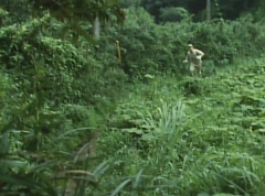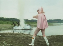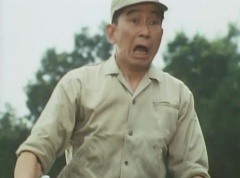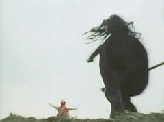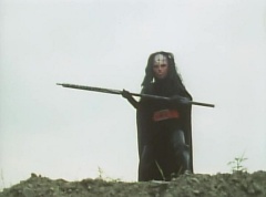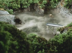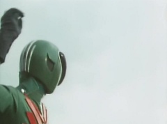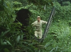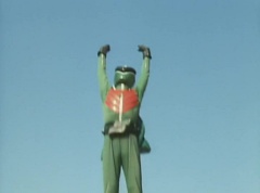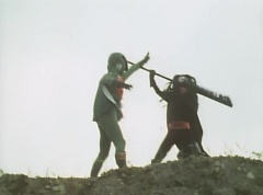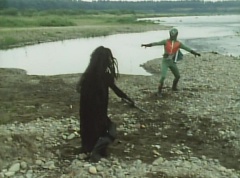 A worker is checking the reservoir and becomes alarmed as the water is evaporating. He starts to run, ready to inform people, when he is stopped by Black Hair Mask. The man is terrified as Black Hair Mask laughs at him.