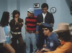 Daita Oiwa and Tsuyoshi Kaijo enter the Gorengers' Secret Base. Tsuyoshi informs Commander Edogawa that there was no trace of the Black Cross Army at headquarters. (Peggy Matsuyama and Kenji Asuka had patrolled headquarters earlier and Peggy reported feeling watched. ) Daita adds, the headquarter staff said they installed the mirror three days ago. Peggy insists that someone was watching her. Daita dismisses it as Peggy being tired. It's hard for a lady to fight the Black Cross Army. Which upsets Peggy even more. I'm not tired at all. Commander Edogawa wants Peggy to take break for two or three days. Peggy protests. Tsuyoshi tries to cheer Peggy up by telling her, lucky you, a summer break! Peggy, Kenji and Haruko Nakamura settled in at the Kanzanji Hot Spring/Sun Hotel. After awhile, Ao Ranger is battling Sun Halo Mask and Mirror Mask. Ki Ranger, Aka Ranger, and Mido Ranger arrive on their Machines. Sun Halo Mask and Mirror Mask are pleased to see them arrive. The four Gorengers stand on top of a building and look down at Sun Halo Mask and Mirror Mask. The four Gorengers leap down to the ground. The four Gorengers surround Mirror Mask and Sun Halo Mask. Mido Ranger declares it's payback time for Momo Ranger! Mirror Mask actives his Sun Mirror, which quickly blinds Mido Ranger. Mirror Mask then proceeds to used his Sun Mirror on Aka Ranger, Ao Ranger, and Ki Ranger with the same results. The four Gorengers retreat. Aka Ranger notes, he reflects sunlight to fire a beam. The four Gorengers face down Sun Halo Mask and Mirror Mask. Ki Ranger states, we won't fall for that. Sun Halo Mask responds, I'm not sure about that. Mirror Mask, get ready for Sun Mirror Dual Attack! Mirror Mask leaps away and then faces Sun Halo Mask. A red beam emits out of Sun Halo Mask's eyes, hits Mirror Mask's mirrors, and the mirrors reflect the beam towards the four Gorengers, who are hit. The four Gorengers try to retreat, but are hit once more with the Mirror Dual Attack. Ki Ranger suggests they use Gorenger Storm. Mido Ranger questions doing it without Momo Ranger. This makes Ao Ranger realized why they had targeted her alone. Aka Ranger suggests they wait for clouds to cover the sun. Once the clouds cover the sun, the four Gorengers take their chance. Sun Halo Mask tells Mirror Mask it's time for another sun Mirror Dual Attack. Mirror Mask does so, and the four Gorengers duck down. They jump down into a passageway and take cover as another Mirror Dual Attack strikes. Sun Halo Mask gives the order for the Zolders to blow it up. The Zolders race forward as the four Gorengers evacuate. The Zolders throw bombs at the power plants one and two and destroy them. Later, there is heavy presence of EAGLE soldiers at Power Plant 3 as the destruction of it will paralyze the entire EAGLE Kanto branch. Close by the four Gorengers are waiting on their Machines for Black Cross Army. The Black Cross Army was making their way towards the power plant. Aka Ranger pulls out his Silver Shot. Ao Ranger pulls out his Blue Cherry. Mido Ranger pulls out his Midomerang. Aka Ranger soon spots Black Cross Army. The four Gorengers charge towards them on their Machines. Explosions erupt as the two groups pass each other. Sun Halo Mask jumps out of the jeep - he is angry that he can't see the Gorengers. The four Gorengers are standing above them. The Zolders race towards the four Gorengers. Ao Ranger strikes a couple of Zolders. Aka Ranger pulls out his Red Vute and strikes several Zolders with it. Ki Ranger tosses a Zolder down a hill, knocking several other Zolders on the way down. Mido Ranger kicks a Zolder. Ao Ranger punches a Zolder. Aka Ranger uses his Red Vute to strike the shrubs several times, making the Zolders fall out of their hiding spot. Mido Ranger fights a Zolder with his Midomerang. Ki Ranger punches a Zolder. Ao Ranger uses Blue Cherry and strikes a Zolder. Mido Ranger fights another Zolder with his Midomerang. He tosses his Midomerang towards several Zolders, knocking them down. Aka Ranger kicks a Zolder down the hill. Sun Halo Mask tells Mirror Mask, let's attack the power plant now! Sun Halo Mask and Mirror Mask are ready to take off but are stopped by Peggy standing above them. Ki Ranger shouts out to Peggy, you must take it easy! Aka Ranger shouts that she must go home. Peggy replies, I will, once I pay them back. Peggy kicks away a Zolder. Peggy transforms into Momo Ranger. Several Zolders run towards her and she throws her Earrings Bomb at them, destroying them. The rest of the four Gorengers join Momo Ranger. Sun Halo Mask and Mirror Mask prepare for another Sun Mirror Dual Attack. The Gorengers duck down to avoid the attack. The Gorengers survive. Sun Halo Mask and Mirror Mask launch another Sun Mirror Dual Attack. They avoid being hit. Momo Ranger comes up with an idea. She takes out her Momo Mirror. Momo Mirror enlarges. Mirror Mask sends a powerful beam towards Momo Mirror and the mirror reflects it back to Mirror Mask. An explosion erupts in front of Sun Halo Mask and Mirror Mask. Mirror Mask rolls down a hill. The reflection had made Mirror Mask mad and he relentlessly attacks Sun Halo Mask. The Gorengers watch from above. Ki Ranger wonders what is going on with the two. Eventually, Sun Halo Mask retreats. Still confused, Mirror Mask uses his staff to strike at nothing. Suddenly, Mirror Mask runs towards the Gorengers with his staff aimed at them. The staff misses them and returns to Mirror Mask. Mirror Mask tries again. This time it strikes a boulder and breaks it apart. The Gorengers prepare to summon Gorenger Storm. Momo Ranger places a pink ball on the ground and kicks it towards Ki Ranger. Ki Ranger head butts the yellow ball towards Mido Ranger. Mido Ranger kicks the green ball towards Ao Ranger. Ao Ranger kicks the blue ball towards Aka Ranger. Aka Ranger jumps into the sky and kicks a red, spikey ball towards Mirror Mask. Gorenger Storm hits Mirror Mask and destroys him. The Gorengers run towards a bl