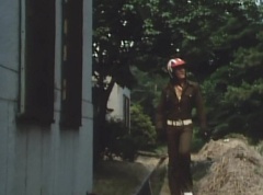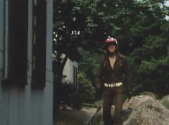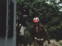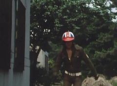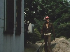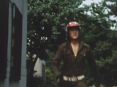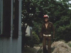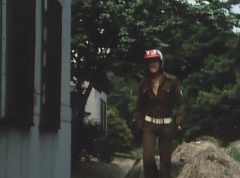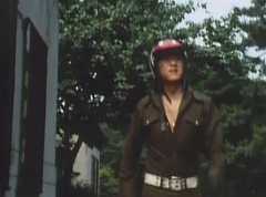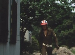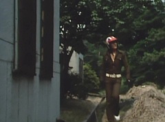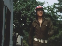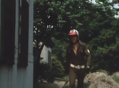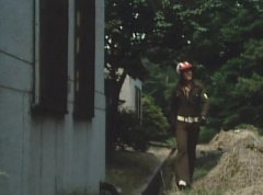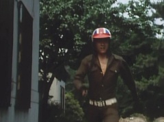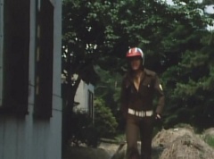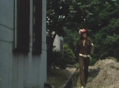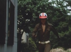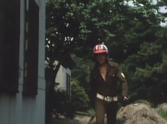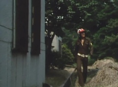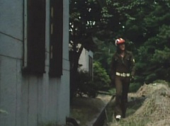 Several of EAGLE's soldiers are patrolling the Kanto Nuclear Power Plant #1 and the EAGLE Headquarters. Kenji Asuka and Peggy Matsuyama arrived on their Machine. They are also patrolling the area. Eventually they get off their Machine and decided to patrol different areas on foot. After awhile, Kenji enters a building and Momo Ranger runs into him. Kenji is concerned and asks what happened? Momo Ranger asks Kenji, did someone run through here? Kenji responds no and Momo Ranger takes off running. Kenji is confused. Afterwards, at the Gorengers' Secret Base, Peggy tells Kenji, Commander Edogawa, and Akira Shinmei, what had happened with a strange mirror. She knows someone was watching her. Kenji dismisses it as her mind playing tricks. It happens sometimes. Peggy is adamant that it was real. Tsuyoshi Kaijo and Daita Oiwa enter. Tsuyoshi informs Commander Edogawa that there was no trace of the Black Cross Army at headquarters. Daita adds, the headquarter staff said they installed the mirror three days ago. Peggy insists that someone was watching her. Daita dismisses it as Peggy being tired. It's hard for a lady to fight the Black Cross Army. Which upsets Peggy even more. I'm not tired at all. Commander Edogawa wants Peggy to take break for two or three days. Peggy protests. Tsuyoshi tries to cheer Peggy up by telling her, lucky you, a summer break!