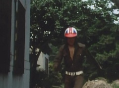 Kenji, Daita, Tsuyoshi, and Peggy keep watch and when Rainbow Fortress appears, they quickly transform. Using their Birdies, they quickly fly to where Rainbow Mask is. The Gorengers quickly surround Rainbow Mask. Ao Ranger fires his Blue Cherry at Rainbow Mask. It hits his staff. Rainbow Mask angrily removes the arrow. Rainbow Mask sends the Zolders after the Gorengers. Aka Ranger kicks several of the Zolders. Ki Ranger punches and then tosses a Zolder. Momo Ranger kicks a couple of Zolders. Ao Ranger hits a Zolder. Mido Ranger fights a couple of Zolders with his Midomerang. Aka Ranger uses his Red Vute and strikes a Zolder. Mido Ranger fights another set of Zolders with his Midomerang. Ao Ranger strikes a Zolder. Ao Ranger spots Rainbow Mask watching. Ao Ranger fires his Blue Cherry at a Zolder and it is hit. Momo Ranger uses her Earrings Bomb on several Zolders. Ki Ranger knocks a pair of Zolders against each other. Ao Ranger kicks a Zolder. Mido Ranger throws his Midomerang and hits several Zolders. The Zolders are defeated. The Gorengers quickly surround Rainbow Mask. Rainbow Mask uses his staff to summon Rainbow Fire. Several explosions erupt in a circle around Rainbow Mask. The Gorengers retreat high up in the trees. Rainbow Mask uses his staff to summon Cannon Fire. Several more explosions erupt on the ground. The Gorengers race after Rainbow Mask. In the distance, Sun Halo Mask watches, calls them fools, and leaves. Rainbow Mask hides behind a boulder. Ao Ranger wants to take care of Rainbow Mask. Ao Ranger uses Blue Cherry. Ao Ranger uses his handheld transistor radio and guides the arrow. He had installed a rudder on the arrow, so it curved around the rock. Rainbow Mask is furious and charges towards them with his staff. The Gorengers summon Gorenger Storm. Momo Ranger places a pink ball on to the ground and kicks it to Ki Ranger. Ki Ranger head butts the yellow ball towards Mido Ranger. Mido Ranger kicks the green ball towards Ao Ranger. Ao Ranger kicks the blue ball towards Aka Ranger. Aka Ranger leaps up and kicks the red, spikey ball towards Rainbow Mask. It hits Rainbow Mask and he is destroyed in the explosion. Mido Ranger and the rest of the Gorengers hurry onto Variblune as Rainbow Fortress is about to explode. Variblune quickly takes off and Rainbow Fortress explodes below them. Afterwards, the Gorengers patrol the area on their Machines. Combining their five strengths together, the Gorengers defeated Rainbow Mask. But it's too early to have peace of mind. They know Sun Halo Mask will come up with another dreadful plan.