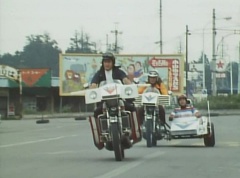 Black Cross Army launched a successful attack on several of EAGLE's branches. From the wreckage, Gorenger was formed to battle Black Cross Army. The Gorenger members were surviving members of various EAGLE branches. To help in their battles against Black Cross Army, Machines were built. There were three Machines, essentially motorcycles. Red Machine was Aka Ranger's motorcycle. Blue Machine had a sidecar, Ao Ranger drove the motorcycle, while Ki Ranger rode in the sidecar. Green Machine also had a sidecar, with Mido Ranger driving and Momo Ranger riding in the side car. Aka Ranger first drove Red Machine as he went to gather the team. Ao Ranger is running across the sands. Several practice dummies pop up in front of him. Ao Ranger takes his Blue Cherry and fires several arrows. Ao Ranger knocks each practice dummy down. Ao Ranger hears someone tell him, impressive and he turns around. It is Aka Ranger on his Red Machine. Aka Ranger tells him well done and drives away. Ao Ranger walks over to the fallen dummies and looks through them, until he finds the one with two words written on it - Snack and Gon. Ki Ranger is working out. He's walking up a volcano while pulling a heavy truck behind him. Ki Ranger gives himself words of encouragement as he works his way along the road. When he hits a turn, he hears someone shout, well done Ki Ranger! Ki Ranger recognizes Aka Ranger below him. Once more, Aka Ranger rides away on his Red Machine. Ki Ranger spots a dog with a sign for a collar. The sign reads Snack Gon. Elsewhere, several practice dummies are driving motorcycles towards Momo Ranger. Momo Ranger takes off one of her earrings and tosses it towards the motorcycles. The earring is a bomb and it explodes, hitting the motorcycles and knocking the practice dummies off. Aka Ranger pulls up behind Momo Ranger. Momo Ranger quickly turns around. Aka Ranger tells Momo Ranger, well done. He tells her, take this, as he tosses a notecard to her. Momo Ranger catches it and reads Snack Gon as Aka Ranger drives away. Elsewhere, Mido Ranger is standing out in a field when several spears fly towards him. Mido Ranger jumps out of the way and the spears miss him. More spears fly towards Mido Ranger and he uses his Midomerang to cut the spears in half and knock them out of the sky. Mido Ranger catches his Midomerang as it returns to him. Suddenly a voice shouts, this is for you Mido Ranger! Mido Ranger watches Aka Ranger drive away on his Red Machine. He holds up his Midomerang and sees the note Snack Gon attached to it. After delivering all the messages, Aka Ranger drives along the streets, heading for Snack Gon. Everyone meets at Snack Gon, and then exit through a door to take a elevator below to their new base. On the way, they meet with Ao Ranger. After entering their new base, they are given their first mission, to rescue children at a gun power factory and to destroy Gold Mask. Tsuyoshi flicks a switch and another set of doors open. Inside this room are their vehicles, Red Machine, Blue Machine, Green Machine, and Variblune. Tsuyoshi tells Akira that Variblune is his. Daita tells Akira that he wants to ride with him and Akira agrees. Tsuyoshi tosses helmets to Kenji and Peggy. Akira and Daita enter Variblune, Tsuyoshi hops onto Red Machine, and Kenji and Peggy get on Green Machine, with Kenji driving and Peggy sitting in the sidecar. Tsuyoshi, Kenji, and Peggy exit through a tunnel that takes them back into the city as Variblune flies towards the factory. At the gun power factory, Gold Mask is giving instructions to the Zolders. He tells them to lock up the kids and to take all the gunpowder. Soon they all notice Variblune above them. Police arrive to try and rescue the kids, but they are rapidly killed by the firing guns of the Zolders. Kenji, Peggy, and Tsuyoshi arrive on their Machines. Variblune drops it's buckets on the building's roof and smashes a hole into the roof. The buckets open and attached to the school bus. The school bus is lifted up and through the roof. After the rescue, the factory explodes. On his Red Machine, Tsuyoshi pursues Gold Mask. The Zolders throw bombs at Tsuyoshi. Tsuyoshi does his best to outmaneuver the bombs, but he is eventually knocked off his Red Machine. A battle soon follows and eventually Gold Mask is destroyed by the Gorengers and their Gorenger Storm. Afterwards, on their machines, Kenji, Peggy, Tsuyoshi, Akira, and Daita drive along the road, knowing their battle with Black Cross Army has only just begun.