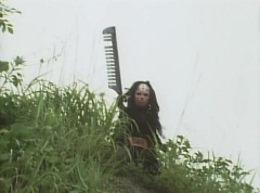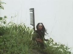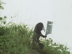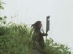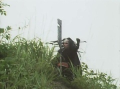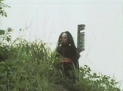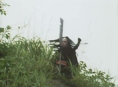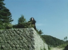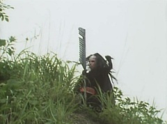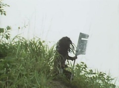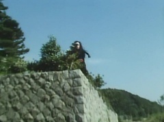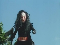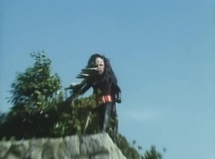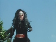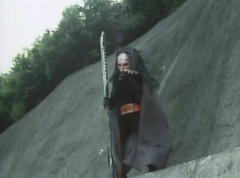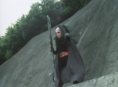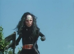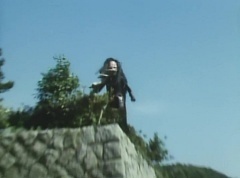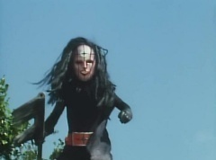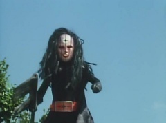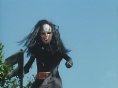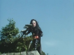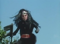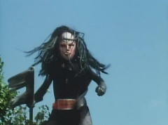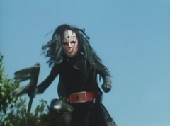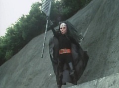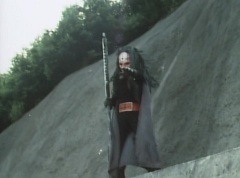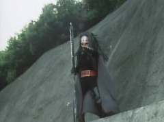 Afterwards, a Black Cross Army truck makes it's way to White Mountain Reservoir. Following behind is Tsuyoshi, Daita, and Akira on their Machines. Tsuyoshi manages to get ahead of the truck and stops in front of it. The truck stops as Tsuyoshi tells them, I will not allow you to get to the reservoir. Akira fights several Zolders. Tsuyoshi fights punches another Zolder several times. Daita head butts a Zolder. Tsuyoshi fights another batch of Zolders. Sun Halo Mask gives the order to kill all three of them! Tsuyoshi transforms into Aka Ranger. Aka Ranger fights another group of Zolders. Ao Ranger kicks several Zolders. Ki Ranger strikes a Zolder several times. Aka Ranger fights another batch of Zolders. He uses his Red Vute to strike several of them. Sun Halo Mask shouts, time to stop this meaningless fight! Sun Halo Mask shoots his beam towards Aka Ranger. As Aka Ranger avoids being hit, Sun Halo Mask tells Black Hair Mask he is going to the reservoir now. Yoko is struggling as Peggy tells her to hang in there. She tells Kenji, we need to find a way out of here! Kenji responds, leave it to me! Kenji transforms into Mido Ranger. Mido Ranger Meanwhile, Kenji and Peggy break the glass of their cabin and escape.