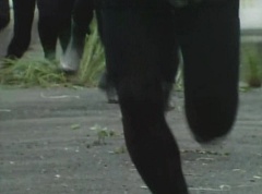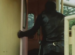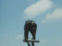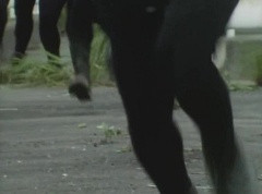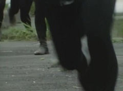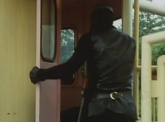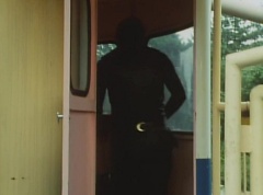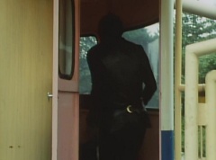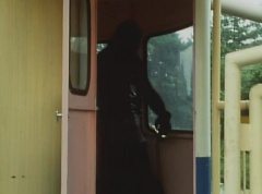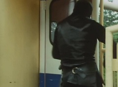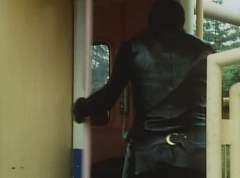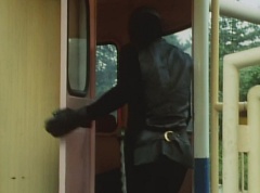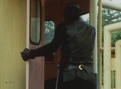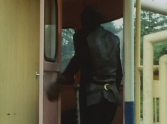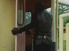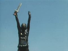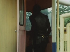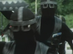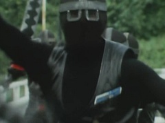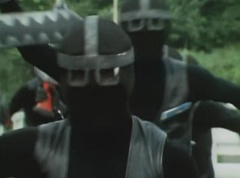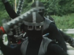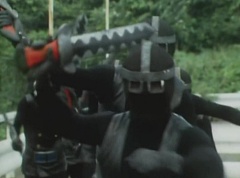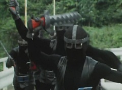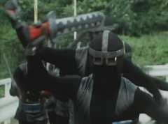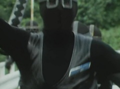 Black Hair Mask walks up, laughing. Sun Halo Mask is there as well. Black Hair Mask shouts, Black Hair Shoot! A clump of black hair attaches itself to the cabin. The cabin is soon covered in black hair. Peggy and Kenji try to break out of the cabin. Black Hair Mask laughs and notes it's all going smoothly. Sun Halo Mask orders a Zolder to turn on the switch. The Zolder does so and the cabin begins to move on it's rotation. Black Hair Mask and Sun Halo Mask watches the cabin lift into the air. Black Hair Mask notes they can't go anywhere now! The cabin continues it's way to the top of the Ferris Wheel. Black Hair Mask has a Zolder stop the cabin. The cabin is now stuck on top of the Ferris Wheel. Black Hair Mask tells Sun Halo Mask, start Operation Japan Desertification right now! They leave the amusement park. Afterwards, a Black Cross Army truck makes it's way to White Mountain Reservoir. Following behind is Tsuyoshi, Daita, and Akira on their Machines. Tsuyoshi manages to get ahead of the truck and stops in front of it. The truck stops as Tsuyoshi tells them, I will not allow you to get to the reservoir. Akira fights several Zolders. Tsuyoshi fights punches another Zolder several times. Daita head butts a Zolder. Tsuyoshi fights another batch of Zolders. Sun Halo Mask gives the order to kill all three of them! Tsuyoshi transforms into Aka Ranger. Aka Ranger fights another group of Zolders. Ao Ranger kicks several Zolders. Ki Ranger strikes a Zolder several times. Aka Ranger fights another batch of Zolders. He uses his Red Vute to strike several of them. Sun Halo Mask shouts, time to stop this meaningless fight! Sun Halo Mask shoots his beam towards Aka Ranger. As Aka Ranger avoids being hit, Sun Halo Mask tells Black Hair Mask he is going to the reservoir now. Meanwhile, Mido Ranger has broke out the glass window and Variblune has arrived to pick up Mido Ranger, Momo Ranger, and Yoko. Elsewhere, Sun Halo Mask and Black Hair Mask, along with several Zolders walk confidently along a pathway at the reservoir. Soon, Aka Ranger, Ao Ranger, and Ki Ranger face down Sun Halo Mask, Black Hair Mask, and several Zolders.