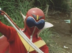 The Gorengers had been notified that EAGLE Agent 0010 had obtained the Hurricane Diode from Wing Mask. Aka Ranger, on his Machine, along with Momo Ranger and Mido Ranger, on their Machine, were on the way. Unfortunately Wing Mask had gotten the Hurricane Diode back from EAGLE Agent 0010, by causing his car to crash and knocking him unconscious. The three Gorengers arrive at the accident. Wing Mask and his Zolders are still there. Wing Mask has the Zolders attack. Aka Ranger leaps into the air and strikes a Zolder with his Red Vute. Mido Ranger fights another Zolder. He strikes the Zolder several times. Momo Ranger is fighting another group of Zolders. She lands a hard kick on one of the Zolders. Aka Ranger battles yet another set of Zolders with his Red Vute. Momo Ranger uses her Earrings Bomb and tosses it towards another group of Zolders. Wing Mask throws his Condor Wing towards the three Gorengers. Mido Ranger throws his Midomerang to strike Condor Wing. Aka Ranger fights another Zolder using his Red Vute to strike the Zolder several times. Wing Mask grabs Yuki, a young girl that was close by, and tells the Gorengers, don't move. The three Gorengers stop fighting the Zolders and watch as Wing Mask leaves with Yuki. As Wing Mask is driven away, he uses his weapon to fire at the three Gorengers running after them. Later, Peggy is captured by Wing Mask and is tied to a steel tower and Wing Mask strikes Peggy several times. Aka Ranger uses his Red Vute to stop the staff/weapon. Peggy opens her eyes and is very happy to see Aka Ranger. Aka Ranger fights Wing Mask as Mido Ranger fights the Zolders. Mido Ranger uses his Midomerang to cut through Peggy's binds, freeing her. Peggy joins in the fighting, giving a kick to a Zolder. She uses the steel tower to kick another Zolder. Peggy then transforms into Momo Ranger. Momo Ranger fights another Zolder. Aka Ranger joins in the fight against the Zolders. Aka Ranger punches a Zolder several times. After defeating the Zolder, Aka Ranger faces down Wing Mask. Behind him stands Momo Ranger and Mido Ranger. Wing Mask tries to strike Momo Ranger with his staff/weapon but is blocked. Wing Mask tries again and this time he is stopped by Aka Ranger. Aka Ranger grabs onto the staff/weapon until Wing Mask yanks it out of Aka Ranger's hand. Wing Mask tries to strike Aka Ranger with his staff/weapon but Aka Ranger blocks the blow. Aka Ranger lands a kick and Wing Mask makes his getaway. Aka Ranger, Mido Ranger, and Momo Ranger follow Wing Mask. There they are tricked into entering a cell and are trapped until Ao Ranger and Ki Ranger arrived. Ki Ranger uses his strength to lifts bars of the cell and free his friends. Wing Mask is ready to start his hurricane plan. Before Wing Mask can do anything a voice yells at them from above. It's Aka Ranger, along with Ao Ranger, Ki Ranger, Mido Ranger, and Momo Ranger. Wing Mask is not happy to see the Gorengers. Wing Mask commands the Zolders to attack. The Gorengers and Zolders fight. Aka Ranger uses his Red Vute against a Zolder. Mido Ranger kicks a Zolder aside. Ki Ranger tosses a Zolder. Ao Ranger strikes a Zolder with his Blue Cherry. Ki Ranger lifts a Zolder into the sky as Ao Ranger takes aim at it with his Blue Cherry and hits it out of the sky. Ki Ranger strikes a Zolder and then tosses it aside. Mido Ranger lands several chops on a Zolder. Aka Ranger strikes another Zolder with his Red Vute. Momo Ranger flips a Zolder onto the ground. Then she releases her Earrings Bomb on a pair of Zolders. Aka Ranger uses his Red Vute to fight three Zolders. Mido Ranger throws his Midomerang towards a Zolder and knocks it to the ground. Momo Ranger fights another Zolder. She lands several punches on the Zolder and then shoves the Zolder aside. Ao Ranger fires his Blue Cherry at another Zolder. The Zolders are defeated. Aka Ranger tells Ao Ranger get the diode with Blue Cherry. Ao Ranger aims Blue Cherry towards Wing Mask. Wing Mask tells him if he shoots that arrow, the girl will die. Behind Wing Mask is a Zolder holding Yuki. Ao Ranger lowers Blue Cherry as the rest of the Gorengers gather around him. Wing Mask tells them the balloons Yuki is holding is filled with explosives. Wing Mask laughs as he turns on the Hurricane Diode. Strong Winds immediately hit the Gorengers. Aka Ranger and the rest of the Gorengers struggle to keep their footing. Aka Ranger notices that Yuki's balloons are not moving. Aka Ranger concludes that Yuki's balloons are the eye of the storm. Aka Ranger activates Birdie. Aka Ranger flies high into the sky. Aka Ranger lands in the eye of the storm. Aka Ranger strikes the Zolder who is holding Yuki with his Red Vute and the Zolder falls to the ground. Yuki accidentally lets go of her balloons. After some distance, the balloons explode. Wing Mask is furious. Aka Ranger wraps Wing Mask in his Red Vute and throws him quite a distance. Wing Mask gets up as Momo Ranger leaps down and removes Hurricane Diode from Wing Mask. Wing Mask tries to strike Momo Ranger but instead finds himself tossed by Momo Ranger. Wing Mask throws his Condor Wing towards Momo Ranger. Mido Ranger stops Condor Wing with his Midomerang. Condor Wing returns to Wing Mask and he uses it to fire at the Gorengers. The Gorengers easily outmaneuver his explosions. The Gorengers prepare to use Gorenger Storm. Momo Ranger turns around and a pink ball appears in her hands. She places it on the ground and kicks it to Ki Ranger. The ball turns yellow and Ki Ranger hits it with his head towards Mido Ranger. The ball turns green and Mido Ranger kicks it over to Ao Ranger. The ball turns blue and Ao Ranger kicks it over to Aka Ranger. The ball turns red and spikey as Aka Ranger leaps into the sky and kicks it over to Wing Mask. Gorenger Storm hits Wing Mask and destroys him.