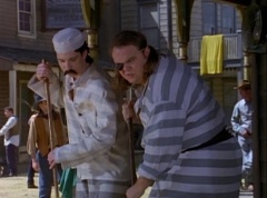 Doc Skullovitch follows at a more leisurely pace. The diving rod pulls One-Eyed Bulk into the water trough. One-Eyed Bulk gets out and Doc Skullovitch asks, how does it taste. One-Eyed Bulk replies, ambrosia. Doc Skullovitch remarks, nectar of the gods. Later, Pink Ranger and her new Rangers defeat Goldar and Needlenose and they are sent back to present time through a time hole. After celebrating, Kimberly is also sent back to her present time through the time hole. White Ranger catches Doc Skullovitch and One-Eyed Bulk. Afterwards, Doc Skullovitch and One-Eyed Bulk are cleaning up the front of Ernest's place as part of their prison program. Ernst walks out with the White Stranger and thanks him for recapturing these rascals. White Stranger replies, all in a day's work.