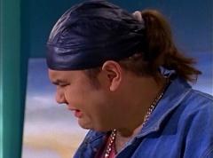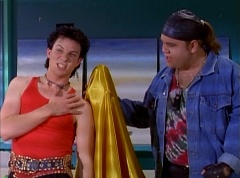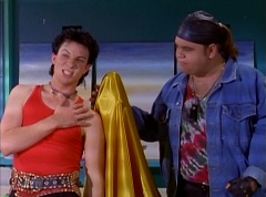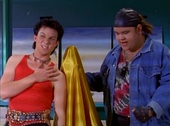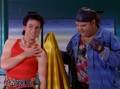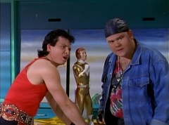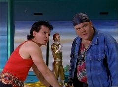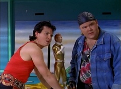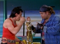Skull and Bulk applaud Violet. Ms. Binx remarks, oh really? Name two? Skull replies, Bulk and Skull. Ms. Binx can only shake her head. Bulk continues, this statue will sit proudly in town square and the Power Rangers themselves, will appear and thank us for our vision. Bulk pulls the cloth off the statue. The statue is dressed in a gold Mighty Morphin costume and looks a lot like Billy. Violet asks Billy if he likes it? Billy is stunned and doesn't know what to say. Skull and Bulk are stunned as well. Bulk asks Violet, what is this suppose to be?