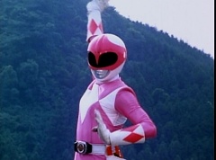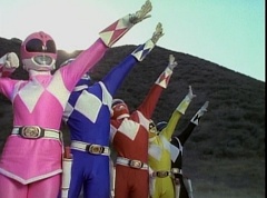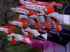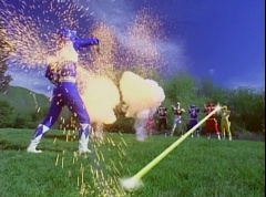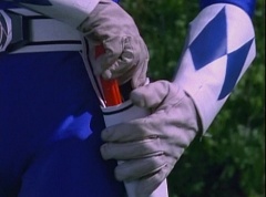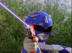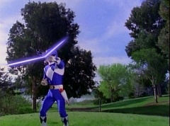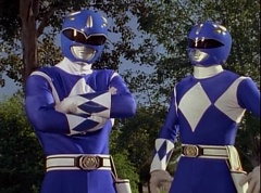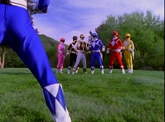 Kimberly glances down at the grass and spots Billy's holographic disc. She picks it up and holds it up in the air. Kimberly asks the Blue Rangers what is this? Evil Blue Ranger replies a mirror. Kimberly replies, wrong, it's a hologram. She has figured out which is the real Blue Ranger. Rocky, Aisha, Tommy, Kimberly, and Adam morph. The real Blue Ranger joins them as they face down evil Blue Ranger. The Rangers blast evil Blue Ranger with their Blade Blasters and he is quickly destroyed.