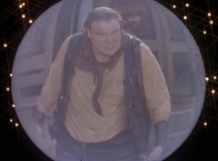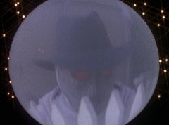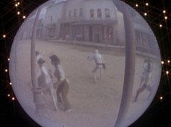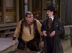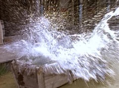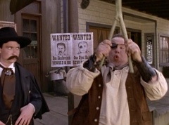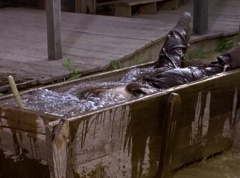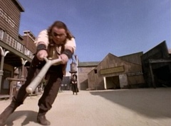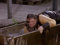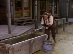 Suddenly the diving rod pulls One-Eyed Bulk down the dirt road. Doc Skullovitch follows at a more leisurely pace. The diving rod pulls One-Eyed Bulk into the water trough. One-Eyed Bulk gets out and Doc Skullovitch asks, how does it taste. One-Eyed Bulk replies, ambrosia. Doc Skullovitch remarks, nectar of the gods.