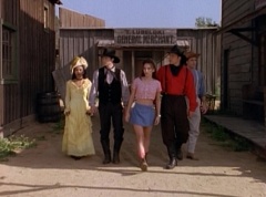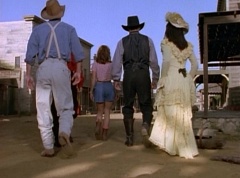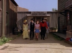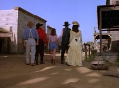 Kimberly leads Miss Alicia, Abraham, Rocko, and William through what seems to be an empty town. Kimberly cautions them to just keep your eyes open and stay near me. Rocko thinks the varmints have left town. Kimberly replies, I wouldn't count on it. They are here somewhere. The five continue down the road.