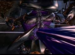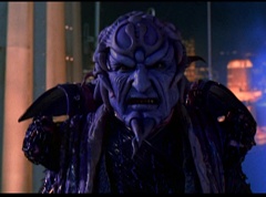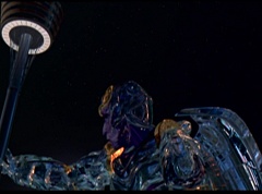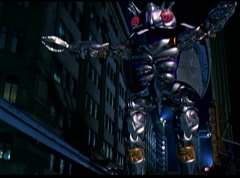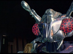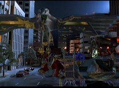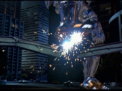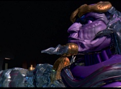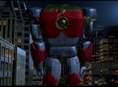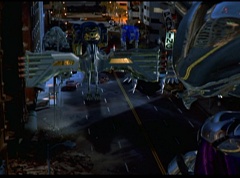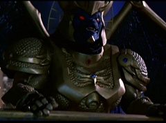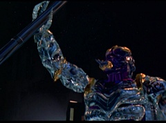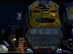 Hornitor flings Ninja Ape Zord off his back. The rest of the Ninja Zords gather together and face Hornitor. Ivan Ooze is very upset - they've destroyed my beautiful creations. Now I'm beginning to get really angry! Ivan Ooze turns into goo and oozes it's way into Hornitor. Goldar cheers for Ivan Ooze. Hornitor's face dissolves and Ivan Ooze's face takes it's place. Goldar flies away as Ivan Ooze breaks off the tower they were standing on. Ivan Ooze steps onto the monorail, breaking it apart as he approaches the Ninja Zords. White Ranger states we need Ninja Megazord now! The Ninja Zords prepare to combine.