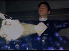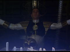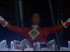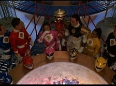 The Rangers form a circle around Zordon's tube. They hold up their hands and their fingertips touch each other. The Great Power emits from their animal spirits and surrounds Zordon and the Command Center. The Command Center repairs itself. The Great Power enters Zordon and with a deep gasp, Zordon is alive. Zordon's tube repairs itself.