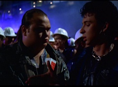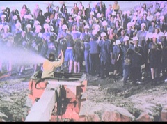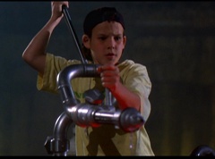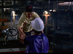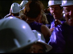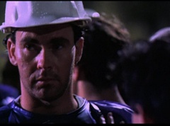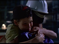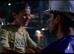 The destruction of Ivan Ooze breaks the spell the parents were under. Most of them are bewildered as water sprays on them. Fred notices and turns off the water. The parents are still confused but happy to see their kids. Bulk wants to give Skull a hug, but Skull insists on a handshake. Fred scans the crowd for his father. He spots him and calls out to his dad. Fred's dad hurries over to him and helps him out of the bucket. They hug each other.