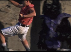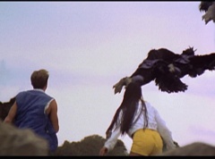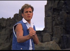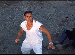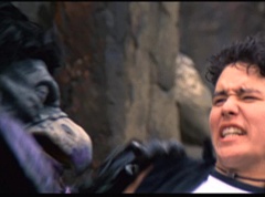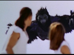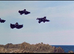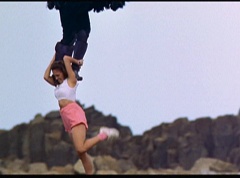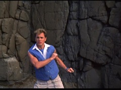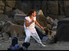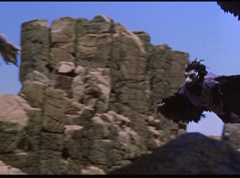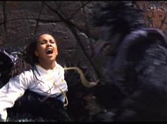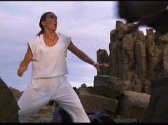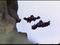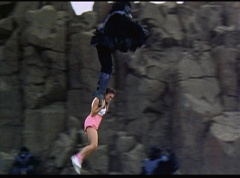 Kimberly feels a little better and they turn to join their friends when suddenly a Tenga Warrior flies straight at them. They quickly duck down. Rocky, Adam, Billy, and Aisha get into a fight stance as four Tenga Warriors head for them. They all duck down as well. The Tenga Warrior comes back around for Tommy and Kimberly and they jump out of the way. The rest of the Tenga Warriors are flying all around Aisha, Rocky, Billy, and Adam. Kimberly and Tommy join their friends. As the Tenga Warriors continue to fly towards them, the teens take cover. Rocky and Kimberly kick two of the Tenga Warriors away. Aisha gives a Tenga Warrior a strong kick. Billy flips over a Tenga Warrior headed his way, which causes the Tenga Warrior to crash into a wall of rock. Billy notes you don't appreciate morphing until you can't do it. A Tenga Warrior knocks Billy aside. Another one knocks Rocky aside as well. Kimberly fights a Tenga Warrior unaware there is one behind her. The Tenga Warrior hooks his claws into her shoulders and lifts Kimberly off the ground, flying away with her. A couple of Tenga Warriors knock Tommy to the ground. Kimberly screams for help.