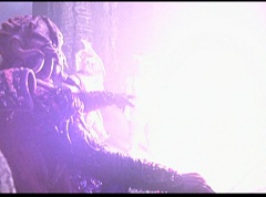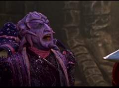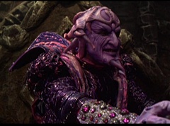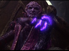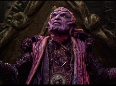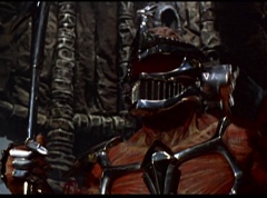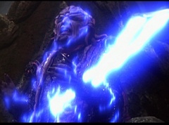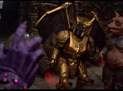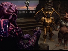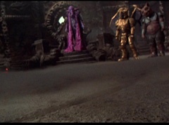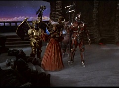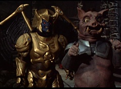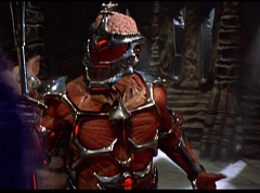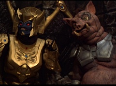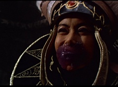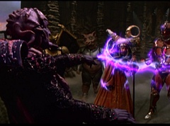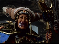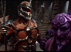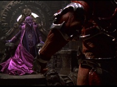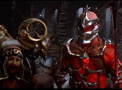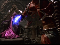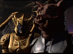 Ivan Ooze shoots out some slime which seals Rita's mouth close. Lord Zedd is happy - finally someone shut her up! Rita tries to remove the slime, and it shock her. Ivan Ooze tells them, you feebleness is staggering. You obviously need a vacation. I think circumstances force us to choose a new leader, and I pick...me! Ivan Ooze laughs. Lord Zedd becomes angry, who does this clown think he's dealing with? Ivan Ooze sits on Lord Zedd's throne and tells them the bogeyman is taking over. Lord Zedd is furious - no one double-crosses Lord Zedd and lives! Lord Zedd uses his staff to direct power to destroy Ivan Ooze. Instead it makes him laugh. Ivan Ooze then uses his power to place Rita Repulsa and Lord Zedd inside a snow globe. Ivan Ooze gives it a good shake. Ivan Ooze tells Mordant and Goldar they have a choice. You either serve me, or you can join these insufferable dingledorks! Lord Zedd demands that Goldar gets them out of there and not to listen to Ooze. Instead Goldar gives his alliance to Ivan Ooze, as does Mordant. Goldar asks what are we going to do about the Power Rangers?