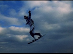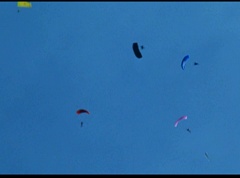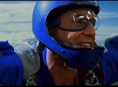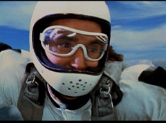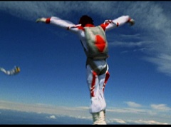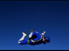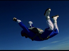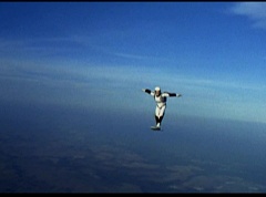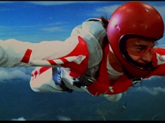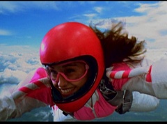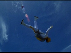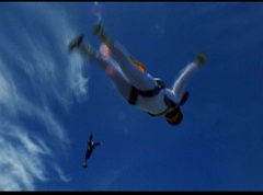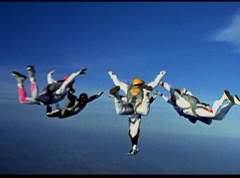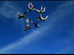 The six friends did several flips and stunts in the air and then they gather together to form a circle. Holding hands, they are laughing and having a great time. After a few moments, the groups breaks apart. As they fall towards the ground, they release their parachutes.