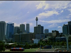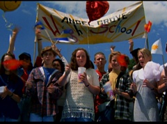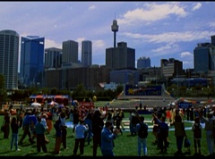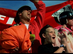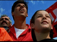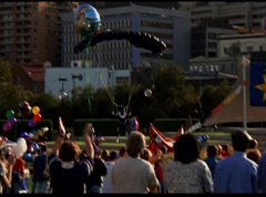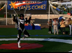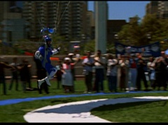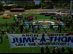 Below at the target sight, the announcer states, with the arrival of Ryan's Comet, just two days away, the Angel Grove Jump-a-thon will breathe new life into the old observatory. Tickets to see the comet are available at the fire fighters booth. A crowd has gathered around the landing area. The announcer announces, raise your eyes to the skies. Now here comes the team from Angel Grove High! The crowd cheers. A young boy, Fred, and his dad are in the crowd cheering. Fred tells his dad, pay close attention. This is how the pros do it. Fred's dad replies that he didn't do so bad. Fred states, you landed in the parking lot. It was embarrassing. The dad isn't too fazed. The pair return to watching the skies. Adam lands first and hits the target dead center. Next is skydiver Billy, who manages a perfect landing.