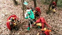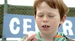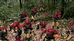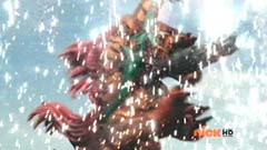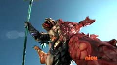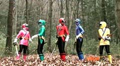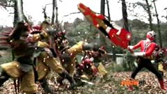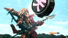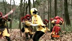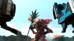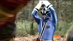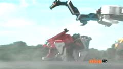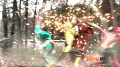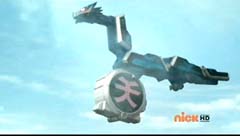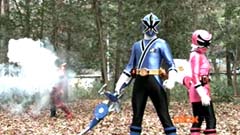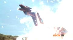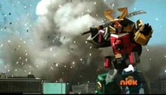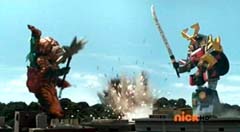 Suddenly Red Ranger, Yellow Ranger, and Green Ranger arrive. They battle Doubletone with their Spin Swords. Doubletone is caught off guard and is knocked to the ground. The three Rangers join Pink Ranger and Blue Ranger. Red Ranger tells them they race here as soon as the gap sensor sounded. Pink Ranger tells them thanks and that they got here just in time. Doubletone summons Moogers. Moogers appear from beneath the ground. Red Ranger battles the Moogers with his Fire Smasher. Green Ranger uses his Forest Spear to battle and destroy Moogers. Yellow Ranger uses her Earth Slicer in the battle. Pink Ranger summons her Sky Fan and Blue Ranger summons his Hydro Bow. Just as their weapons transform, Doubletone uses his Super tsunami attack on them. The two Rangers are able to defeat the attack and defeat Doubletone. Pink Ranger tells him that's what you get for making Ryan so sad. The rest of the Rangers join them. Doubletone is giant size. Blue Ranger and Pink Ranger summon their folding zords. Dragon zord and Turtle zord fly towards Doubletone. Doubletone tries to blast them. Dragon zord returns fire on Doubletone. Dragon zord and Turtle zord team up Dragon zord grabs a hold of Turtle zord and then flings it against Doubletone. Red Ranger suggests to Green Ranger and Yellow Ranger that they join the rest of the Rangers. The three Rangers summon their folding zords. The Samurai Megazord is formed. Samurai Megazord and Doubletone battle. Doubletone manages to knock Samurai Megazord's sword away. Blue Ranger gets an idea. Blue Ranger instructs the Megazord to do a dragon leap. Samurai Megazord leaps high into the air. Pink Ranger commands aerial turtle strike. The Turtle zord disconnects from Samurai Megazord and strikes Doubletone. Turtle zord returns to the Samurai Megazord as it gets it's sword back. Samurai Megazord destroys Doubletone with the Samurai Strike. After the battle, Kevin, Jayden, Mike, Emily, and Mia are at the baseball game. The baseball team is warming up as Ryan sits on the bench and watches them.