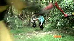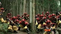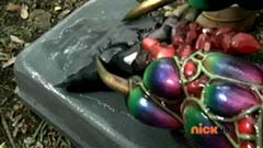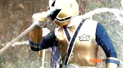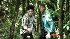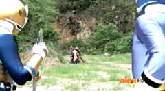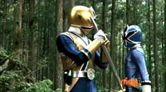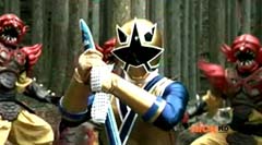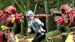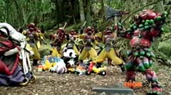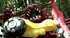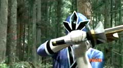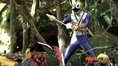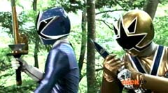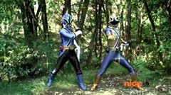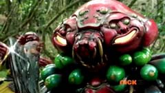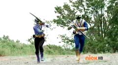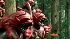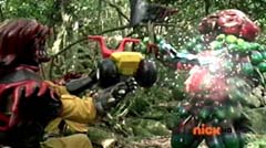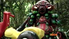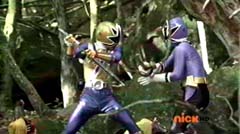 When the clock read 8:01 a.m., Jayden is done with waiting. It's time to take action. Back in the woods, Kevin and Antonio walk along a river bank. Kevin climbs to higher ground. Antonio has a hard time climbing up with his arm in a sling and the muddy surface. Kevin sees Antonio having a hard time and offers his hand. Antonio grins as he takes Kevin's hand and is pulled up. They are immediately confronted by Moogers. Antonio tells Kevin to take a deep breath, because a battle is about to begin. Antonio takes his sling off and rips the fabric in two, giving one piece to Kevin. He tells Kevin, tie the Spin Sword to your wrist. That way the Nighlok slime won't affect your grip. Kevin is impressed. Kevin and Antonio morph. Blue Ranger and Gold Ranger race towards the Moogers. Soon they are in the midst of a battle. Gold Ranger and Blue Ranger do well against the Moogers and they are soon defeated. Gold Ranger and Blue Ranger take off to search for Antberry. Meanwhile, Antberry has just finished sharpening his ax. Octoroo tells them to start with the coolest toy. A Mooger picks up a bike and presents it to Antberry to chop. Octoroo tells him to get going, time's a wasting. Antberry is about to strike when Dragon Folding Zord flies in and hits Antberry several times. Dragon Zord also knocks the ax out of Antberry's hand as Blue Ranger and Gold Ranger leap in. The ax falls into the well. Octoroo is very upset. Blue Ranger battles the Moogers with his Spin Sword. Gold Ranger battles the rest of the Moogers with his Barracuda Blade. The Moogers are defeated. Gold Ranger and Blue Ranger go search for Octoroo and Antberry. When they are found, Octoroo tells them they destroyed his favorite toy. Antberry is ready to destroy the two Rangers. Gold Ranger taunts, bring it on slime ball! Gold Ranger and Blue Ranger race towards Antberry with their weapons drawn. Antberry uses his slime attack. Tying their weapons to their wrists works.