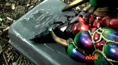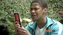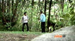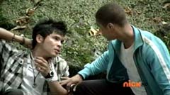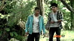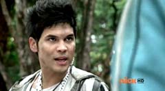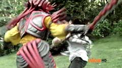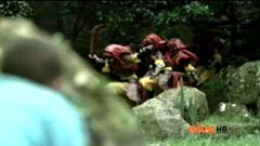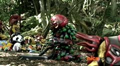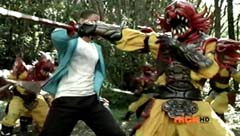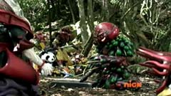 The Moogers search the woods. Kevin, hidden, watches them for a moment. Antonio is making a sling for his arm. Kevin sits by Antonio and tries his Samuraizer once more, but still no signal. Antonio tells Kevin, we have to hurry back and stop them. Kevin tells Antonio he can't fight with that arm injury. I'll go. Kevin gets up to leave. Antonio tells Kevin he can't go alone. Kevin tells him, don't worry about me. Hide here until the coast is clear and then run and get the others. Kevin takes of running. Antonio calls out to wait, but Kevin keeps going.