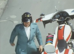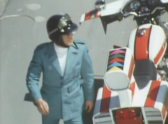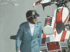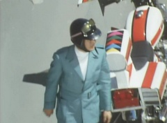 Poison Gas Mask spotted them in the truck's side mirror. The trucks entered a tunnel. Tsuyoshi and Kenji also entered the tunnel, but when they exited, they could no longer see the trucks. As Tsuyoshi and Kenji tried to figure out what happened, Poison Gas Mask appeared above them. Poison Gas Mask fired at them and green gas began to fill the area. Tsuyoshi quickly rolled out of the way and shouted at Kenji to transform. The two transformed into Aka Ranger and Mido Ranger. Aka Ranger landed on one side of Poison Gas Mask and Mido Ranger landed on the other side of Poison Gas Mask. Aka Ranger used his Red Vute against Poison Gas Mask and it wrapped around Poison Gas Mask's wrist. Poison Gas Mask struggled to free himself. Mido Ranger threw his Midomerang towards Poison Gas Mask. When the blast cleared, Poison Gas Mask was gone. Mido Ranger was convinced Poison Gas Mask was back in the tunnel. Aka Ranger and Mido Ranger ran back into the tunnel. Green gas began to pour into the tunnel. Aka Ranger and Mido Ranger were having a difficult time. Aka Ranger spotted Poison Gas Mask and raced over to him. Aka Ranger tried to use his Red Vute but Poison Gas Mask got away before he could strike. Poison Gas Mask appeared behind Mido Ranger. When Mido Ranger turned around, Poison Gas Mask struck him. Mido Ranger landed hard on the pavement. Aka Ranger ran over to check on his friend. Angry, Aka Ranger used his Red Vute, but Poison Gas Mask vanished before it could strike. Aka Ranger heard Poison Gas Mask's laugh and heard him say, until we meet again. At the Gorenger's Secret Base, Commander Edogawa informed the team it appears Black Cross Army is planning on constructing a murderous poison gas factory. Peggy notes how scary that is and that they need to find and destroy them as soon as possible. Commander Edogawa tells them first they need to find the factory immediately. Kenji volunteers for the task. Akira tells Kenji not to ask for more than he can handle. But Kenji wants to defeat Poison Gas Mask. Commander Edogawa tells Kenji the duty of the Gorengers is not to seek revenge. Put your interest in the Black Cross Army aside. We must rescue all of the victims. Later, Cook enters Gorengers' Secret Base, with a plate of curry in his hand. Daita thinks the curry is for him. Cook passes him the plate and informs the team that Poison Gas Mask was just in Snack Shop Gon. Cook walks over to the computer and turns on a screen. They all see the back of the cloaked figure of Poison Gas Mask walking along a sidewalk. Kenji vows to get him. Cook tries to stop him, but Kenji is already gone. After awhile, a signal goes off on the computer. Peggy answers and tells the rest that Mido Ranger had just called. Tsuyoshi, Daita, Akira walked over and Tsuyoshi takes the headphones to listen. Mido Ranger quickly tells them there is a poison gas factory on the grounds of Sulfur Valley. Black Cross Army is going to use the gas pressure from the ground. It needs to be destroyed. Tsuyoshi, Akira, Daita, and Peggy decide to leave the base as well. Ao Ranger, Momo Ranger, Ki Ranger, and Aka Ranger travel in Variblune. Variblune lands by the factory. The four Gorengers exit Variblune with their Machines. The four Gorengers continue to make their way towards the factory on their machines. As they pass rocks seeping gas, Aka Ranger stops his Machine. In the distance, Mido Ranger is tied to a cross. Momo Ranger is eager to reach Mido Ranger, but Aka Ranger stops her and warns her of the gas. Ki Ranger has the equipment ready to test the gas. After testing, Ki Ranger reports that it is natural gas. The four Gorengers climb their way towards Mido Ranger. Aka Ranger calls out to Mido Ranger, but he does not respond. Momo Ranger checks and reports there is no heartbeat. Ao Ranger states a charge is needed. Aka Ranger summons Gorengers Charge. The four Gorengers step back a little. With their hands on each other, they summon up their power and use it to charge Mido Ranger. Mido Ranger is revived. Mido Ranger breaks free and joins his team and points where the poison gas factory is. The Gorengers make their way towards the factory. They stop when Poison Gas Mask and several Zolders are spotted. Poison Gas Mask commands the Zolders to attack. The Gorengers and Zolders fight each other. Aka Ranger wraps his Red Vute around a Zolder and defeats it. Mido Ranger fights two Zolders with several kicks. Momo Ranger fights another pair of Zolders with several chops. Ki Ranger knocks the Zolders against each other. Ao Ranger fights a Zolder with several chops. Ki Ranger distracts another group of Zolders and then punches the leader, causing the leader and the Zolders behind him to fall to the ground. Aka Ranger fights another Zolder with his Red Vute. It wraps around the Zolder's neck and Aka Ranger gives a kick, knocking the Zolder aside. Ao Ranger punches another group of Zolders. Ki Ranger tries to fight Poison Gas Mask, but is struck and slides down the hill. The rest of the Gorengers race over to Ki Ranger. They stop him from continuing to slide and Ki Ranger apologies, I was a little off guard. Poison Gas Mask jumps and lands closer to the Gorengers. Poison Gas Mask commands to release the poison gas. Below, in the factory, a scientist pulls down a lever, releasing the poison gas. The Gorengers back away from the poison gas. Poison Gas Mask informs them, there are tons of natural gas springs at the bottom of the earth. We invented a device that changes natural gas into poisonous gas. Inhale it as much as you can! The poison gas will spring out unlimitedly. Poison Gas Mask laughs. Ao Ranger uses his Blue Cherry and fires at Poison Gas Mask. Poison Gas Mask vanishes before the arrow can strike. Poison Gas Mask reappears on the ground, a few feet from the Gorengers. Mido Ranger throws his Midomerang towards Poison Gas Mask. Once more, Poison Gas Mask vanishes before the weapon can hit him. Poison Gas Mask appears above them, on the side of t