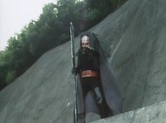 Afterwards, a Black Cross Army truck makes it's way to White Mountain Reservoir. Following behind is Tsuyoshi, Daita, and Akira on their Machines. Tsuyoshi manages to get ahead of the truck and stops in front of it. The truck stops as Tsuyoshi tells them, I will not allow you to get to the reservoir. Akira fights several Zolders. Tsuyoshi fights punches another Zolder several times. Daita head butts a Zolder. Tsuyoshi fights another batch of Zolders. Sun Halo Mask gives the order to kill all three of them! Tsuyoshi transforms into Aka Ranger. Aka Ranger fights another group of Zolders. Ao Ranger kicks several Zolders. Ki Ranger strikes a Zolder several times. Aka Ranger fights another batch of Zolders. He uses his Red Vute to strike several of them. Sun Halo Mask shouts, time to stop this meaningless fight! Sun Halo Mask shoots his beam towards Aka Ranger. As Aka Ranger avoids being hit, Sun Halo Mask tells Black Hair Mask he is going to the reservoir now. Yoko is struggling as Peggy tells her to hang in there. She tells Kenji, we need to find a way out of here! Kenji responds, leave it to me! Kenji transforms into Mido Ranger. Mido Ranger Meanwhile, Kenji and Peggy break the glass of their cabin and escape.