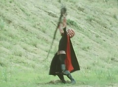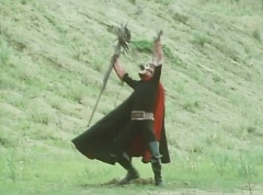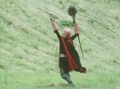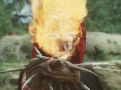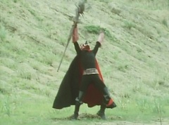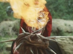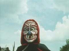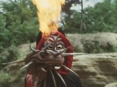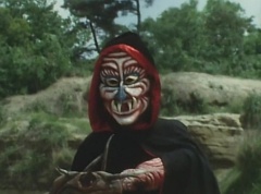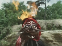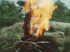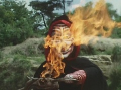 Witch Mask uses it's broom to shoot several fire bombs at the Gorengers. The Gorengers manage to outmaneuver them all. Aka Ranger calls for Gorenger Storm. Momo Ranger turns around and a pink ball appears in her hands. She places the pink ball on the ground and kicks it over to Ki Ranger. When it reaches Ki Ranger, the ball has turned yellow. Ki Ranger head butts the ball towards Ko Ranger. On the way to Ko Ranger, the ball turns blue. Ao Ranger kicks the ball over to Mido Ranger. Once more the ball changes color, this time to green. Mido Ranger kicks the green ball high - over to Aka Ranger. The ball changes one last time. It is now spikey and red. Aka Ranger leaps into up and kicks the ball towards Witch Mask. The ball strikes Witch Mask in the head and destroys her.