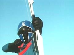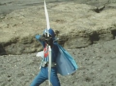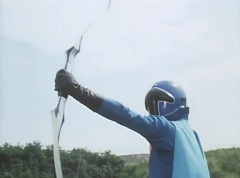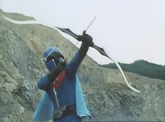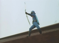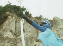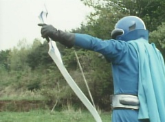 Variblune quickly took to the skies, having learned the EAGLE Kanto Branch Base 16 was attacked by Rainbow Mask's troops. They soon reach the area. Tsuyoshi instructs Akira to continue to look for Rainbow Fortress. Tsuyoshi and the rest of the team deploy. Akira continues on his way to Rainbow Fortress. Eventually Rainbow Mask captures Variblune and pulls into his hanger. Akira transforms into Ao Ranger and ejects out. Ao Ranger is soon battling several Zolders and then Rainbow Mask. Ao Ranger fires his Blue Cherry at Rainbow Mask and strikes him in the face. Rainbow Mask slides out of the arrow. Rainbow Mask makes three clones of himself. Ao Ranger leaps back down and fights Rainbow Mask and his clones. It is difficult as he is outnumbered. Rainbow Mask uses his staff to summon Rainbow Beams. The beams hit Ao Ranger. Rainbow Mask then throws Rainbow ropes towards him and Ao Ranger is quickly covered in it. Rainbow Mask uses his staff and causes part of the ground to sink. The shaking of the ground throws Ao Ranger off balance and he tumbles down. Later, his friends find him and they had back to Gorengers' Secret Base. Later, Akira returns to Rainbow Fortress and gains control of Variblune. He transforms into Ao Ranger and fights Rainbow Mask. Soon the rest of the Gorengers join him. Rainbow Mask sends the Zolders after the Gorengers. Aka Ranger kicks several of the Zolders. Ki Ranger punches and then tosses a Zolder. Momo Ranger kicks a couple of Zolders. Ao Ranger hits a Zolder. Mido Ranger fights a couple of Zolders with his Midomerang. Aka Ranger uses his Red Vute and strikes a Zolder. Mido Ranger fights another set of Zolders with his Midomerang. Ao Ranger strikes a Zolder. Ao Ranger spots Rainbow Mask watching. Ao Ranger fires his Blue Cherry at a Zolder and it is hit. Momo Ranger uses her Earrings Bomb on several Zolders. Ki Ranger knocks a pair of Zolders against each other. Ao Ranger kicks a Zolder. Mido Ranger throws his Midomerang and hits several Zolders. The Zolders are defeated. The Gorengers quickly surround Rainbow Mask. Rainbow Mask uses his staff to summon Rainbow Fire. Several explosions erupt in a circle around Rainbow Mask. The Gorengers retreat high up in the trees. Rainbow Mask uses his staff to summon Cannon Fire. Several more explosions erupt on the ground. The Gorengers race after Rainbow Mask. Rainbow Mask hides behind a boulder. Ao Ranger wants to take care of Rainbow Mask. Ao Ranger uses Blue Cherry. Ao Ranger uses his handheld transistor radio and guides the arrow. He had installed a rudder on the arrow, so it curved around the rock. Rainbow Mask is furious and charges towards them with his staff. The Gorengers summon Gorenger Storm. Momo Ranger places a pink ball on to the ground and kicks it to Ki Ranger. Ki Ranger head butts the yellow ball towards Mido Ranger. Mido Ranger kicks the green ball towards Ao Ranger. Ao Ranger kicks the blue ball towards Aka Ranger. Aka Ranger leaps up and kicks the red, spikey ball towards Rainbow Mask. It hits Rainbow Mask and he is destroyed in the explosion.