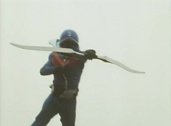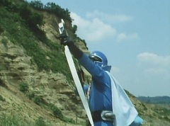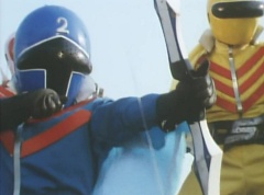 Professor Kudo was attacked and abducted by Samurai Mask. Their mission is to save Professor Kudo and make sure Black Cross Army does not get his equipment. Tsuyoshi leads the group into the adjoining room and they start to get onto their Machines. Once in the city, the teams splits up. Peggy, Tsuyoshi, and Akira search an area and are soon surrounded by Zolders. Samurai Mask is there as well and he laughs at them. Akira recognizes him as the one who had attacked his branch. Samurai Mask gives the order to attack. Peggy, Tsuyoshi, and Akira quickly transform into Gorenger. Aka Ranger fights several Zolders. He uses his Red Vute on the Zolders as he battles them. Momo Ranger lands several kicks on a Zolder. Ao Ranger battles another batch of Zolders. Samurai Mask shoots arrows at the group as they fight. Ao Ranger manages to avoid being hit, but his boot is soon stuck between some rocks. Samurai Mask keeps shooting arrows. This time the arrows hits Ao Ranger in the arm. Aka Ranger battles more Zolders. Samurai Mask tries to shoot arrows at Aka Ranger, but Aka Ranger leaps out of the way. Aka Ranger uses his Red Vute to wrap around Samurai Mask's neck. Samurai Mask struggles and eventually frees himself of the Red Vute. Samurai Mask and Aka Ranger fight each other. Momo Ranger spots the fight. Momo Ranger calls out a warning to Aka Ranger and then throws her Earrings Bomb at Samurai Mask. Samurai Mask appears in the smoke of the explosion and laughs at them and then vanishes. Momo Ranger and Aka Ranger walk over to Ao Ranger. Momo Ranger asks Ao Ranger if he is alright? Ao Ranger replies that he is, although it is obvious he is in pain. Ao Ranger cruses Samurai Mask and they start to head back. Momo Ranger notices the dark outline of something on the ground and asks, what could that be? Aka Ranger replies, it's a human that got hit with the Sand Beam. At the Gorenger Secret Base, Peggy bandages up Akira's arm, telling him to bare with it. Akira pretends the wound doesn't bother him at all. Akira wants to be the one to take down Samurai Mask. Tsuyoshi tells him to simmer down and reminds him that their mission is to safely recover Professor Kudo. Tsuyoshi places his hand on Akira's arm hard and Akira cries out in pain. Later, while Peggy and Tsuyoshi were searching another area, they were captured and taken to Black Cross Army's prison. Soon, Peggy, Tsuyoshi, and Koichi are lead outside by Samurai Mask and several Zolders. Professor Kudo is outside as well, and already tied to a pole. Koichi starts screaming for his father as soon as he sees him. Samurai Mask gives the instructions to kill them all. Professor Kudo is upset and tells Samurai Mask that he had said he would spare Koichi. Samurai Mask tells him, once a human enters our base, none may come out alive! Professor Kudo pleads for the life of his child. Samurai Mask strikes him with his weapon. Professor Kudo asks his son to forgive him. Tsuyoshi's turns on his Communication Device and it begins to flash. A couple of Zolders bring out the Sand Beam. Samurai Mask takes a look at the Sand Beam and tells the Zolder to fire it. The Zolder is taking aim when Variblune arrives above them. A small knife drops out of Tsuyoshi's sleeve and he uses it to cut loose the ropes binding him. Very quickly, Peggy, Tsuyoshi, Professor Kudo and Koichi are freed. Angry Samurai Mask shoves the Zolder aside and fires the Sand Beam at the four. When the smoke clears, the four are gone. Samurai Mask is very surprised and looks around. Above him, stands Peggy, Tsuyoshi, Koichi, and Professor Kudo. Samurai Mask sends the Zolders after them. Peggy and Tsuyoshi immediately begin fighting the Zolders as Professor Kudo gets to safety with his son, Koichi. Tsuyoshi grabs a hold of Zolder and throws it down into the valley. Variblune lowers a clear tube with a small cage. The cage encloses Professor Kudo and Koichi. Akira releases more air pressure, and the air pressure sends Professor Kudo and Koichi up and into the safety of Variblune. Peggy and Tsuyoshi defeat the Zolders. As Variblune flies away, Samurai Mask aims the Sand Beam towards Peggy and Tsuyoshi. Tsuyoshi shouts out a warning and he and Peggy take cover as the Sand Beam hits the side of the mountain. Momo Ranger and Aka Ranger walk out of the smoke. Samurai Mask is surprised. Suddenly Ki Ranger, Ao Ranger, and Mido Ranger appear over them. Momo Ranger and Aka Ranger activates their Birdies. They shoot into the air and soon land beside the rest of the Gorengers. Samurai Mask is furious. The Gorengers jump into the valley and quickly surround Samurai Mask. Samurai Mask angrily asks, who are you?! Aka Ranger responds, Aka Ranger! The rest of the Gorengers also respond with their names, Ao Ranger, Ki Ranger, Momo Ranger, and Mido Ranger! Aka Ranger states, the five of us, together are...GORENGER!! Samurai Mask leaps forward and Ao Ranger stops him. More Zolders arrive. Aka Ranger uses his Red Vute to battle the Zolders. The Red Vute wraps around a Zolder's neck and Aka Ranger flips the Zolder to the ground. Aka Ranger uses his Red Vute against another Zolder. When it's wrapped around the neck of the Zolder, Aka Ranger calls out to Mido Ranger. Mido Ranger gets his Midomerang ready. When Aka Ranger flings the Zolder, Mido Ranger throws his Midomerang towards the Zolder. It hits the Zolder and knocks it off the cliff. Ki Ranger uses his impressive strength and Judo moves to defeat the Zolders he is fighting against. Momo Ranger lands several chops against a Zolder and then a powerful kick. Ao Ranger is fighting several Zolders as Samurai Mask approaches him. Aka Ranger flips over to where Ao Ranger is. Aka Ranger and Ao Ranger fight Samurai Mask. Aka Ranger lands a kick that knocks Samurai Mask down the hill. Two Zolders race over to the Sand Beam as Samurai Mask tries to outrun Ao Ranger and Mido Ranger. Momo Ranger uses her Earrings Bomb and throws it at the Zolders by the Sand Beam, causing the Zolders to