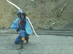 The Gorengers were facing down Poison Gas Mask and several Zolders. Poison Gas Mask commands the Zolders to attack. The Gorengers and Zolders fight each other. Aka Ranger wraps his Red Vute around a Zolder and defeats it. Mido Ranger fights two Zolders with several kicks. Momo Ranger fights another pair of Zolders with several chops. Ki Ranger knocks the Zolders against each other. Ao Ranger fights a Zolder with several chops. Ki Ranger distracts another group of Zolders and then punches the leader, causing the leader and the Zolders behind him to fall to the ground. Aka Ranger fights another Zolder with his Red Vute. It wraps around the Zolder's neck and Aka Ranger gives a kick, knocking the Zolder aside. Ao Ranger punches another group of Zolders. Ki Ranger tries to fight Poison Gas Mask, but is struck and slides down the hill. The rest of the Gorengers race over to Ki Ranger. They stop him from continuing to slide and Ki Ranger apologies, I was a little off guard. Poison Gas Mask jumps and lands closer to the Gorengers. Poison Gas Mask commands to release the poison gas. Below, in the factory, a scientist pulls down a lever, releasing the poison gas. The Gorengers back away from the poison gas. Poison Gas Mask informs them, there are tons of natural gas springs at the bottom of the earth. We invented a device that changes natural gas into poisonous gas. Inhale it as much as you can! The poison gas will spring out unlimitedly. Poison Gas Mask laughs. Ao Ranger uses his Blue Cherry and fires at Poison Gas Mask. Poison Gas Mask vanishes before the arrow can strike. Poison Gas Mask reappears on the ground, a few feet from the Gorengers. Mido Ranger throws his Midomerang towards Poison Gas Mask. Once more, Poison Gas Mask vanishes before the weapon can hit him. Poison Gas Mask appears above them, on the side of the hill. Momo Ranger tells the rest of the Gorengers to leave it to her. Momo Ranger uses her Earrings Bomb and throws it at Poison Gas Mask. An explosion hits the hill, but Poison Gas Mask had already vanished. A cape goes flying through the air and when it lands, it's Poison Gas Mask. Poison Gas Mask gloats that he is immortal. You all will die from the poison gas. Mido Ranger remembers the immortality circuit was place in the back of Poison Gas Mask's head. (Earlier Mido Ranger had been captured, and although tortured, he could still hear the conversation in the next room.) Mido Ranger leaps into the air and lands behind Poison Gas Mask. Mido Ranger prepares to use his Midomerang once more. Poison Gas Mask warns the outcome will be the same, no matter how much you try. Mido Ranger disregards Poison Gas Mask's warning and leaps behind Poison Gas Mask. Poison Gas Mask is confused and tries to spot where Mido Ranger is. Mido Ranger continues to leap and land in various places. Eventually Mido Ranger throws his Midomerang and hits Poison Gas Mask in the back of the head. Poison Gas Mask is furious as he realizes Mido Ranger hit his immortality circuit. Mido Ranger joins the rest of the Gorengers. Poison Gas Mask runs down the rocky hill. The Gorengers summon Gorenger Storm. The silver ball appears in Momo's hands. Momo Ranger kicks it over to Ki Ranger. Ki Ranger hits the ball with his helmet towards Mido Ranger. Mido Ranger kicks it over to Ao Ranger. Ao Ranger kicks it over to Aka Ranger. Aka Ranger leaps into the sky and kicks it towards Poison Gas Mask. Poison Gas Mask is hit and destroyed. Moments later, two scientists place a bomb in the factory. The Gorengers enter the factory and find it strange that there are no Zolders around. Fortunately they quickly discover the bomb. The bomb goes off. The Gorengers help the workers to escape the factory. Several more explosions erupt in the factory. The Gorengers enter Variblune, along with the factory workers. Once everyone is on board, Variblune takes off. As Variblune flies away, more explosions erupt from the ground.