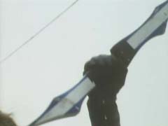 Black Cross Army had developed a Hurricane Diode which Wing Mask was ready to put into action. Wing Mask had tricked and trapped Aka Ranger, Momo Ranger, Mido Ranger in a cell inside a lighthouse. Wing Mask was unaware that Ao Ranger and Ki Ranger had rescued the three. An explosion rocks the lighthouse. Seeing the explosion, Wing Mask is ready to start his hurricane plan. Before Wing Mask can do anything a voice yells at them from above. It's Aka Ranger, along with Ao Ranger, Ki Ranger, Mido Ranger, and Momo Ranger. Wing Mask is not happy to see the Gorengers. Wing Mask commands the Zolders to attack. The Gorengers and Zolders fight. Aka Ranger uses his Red Vute against a Zolder. Mido Ranger kicks a Zolder aside. Ki Ranger tosses a Zolder. Ao Ranger strikes a Zolder with his Blue Cherry. Ki Ranger lifts a Zolder into the sky as Ao Ranger takes aim at it with his Blue Cherry and hits it out of the sky. Ki Ranger strikes a Zolder and then tosses it aside. Mido Ranger lands several chops on a Zolder. Aka Ranger strikes another Zolder with his Red Vute. Momo Ranger flips a Zolder onto the ground. Then she releases her Earrings Bomb on a pair of Zolders. Aka Ranger uses his Red Vute to fight three Zolders. Mido Ranger throws his Midomerang towards a Zolder and knocks it to the ground. Momo Ranger fights another Zolder. She lands several punches on the Zolder and then shoves the Zolder aside. Ao Ranger fires his Blue Cherry at another Zolder. The Zolders are defeated. Aka Ranger tells Ao Ranger get the diode with Blue Cherry. Ao Ranger aims Blue Cherry towards Wing Mask. Wing Mask tells him if he shoots that arrow, the girl will die. Behind Wing Mask is a Zolder holding Yuki - a young girl the Gorengers have been helping. Ao Ranger lowers Blue Cherry as the rest of the Gorengers gather around him. Wing Mask tells them the balloons Yuki is holding is filled with explosives. Wing Mask laughs as he turns on the Hurricane Diode. Strong Winds immediately hit the Gorengers. The Gorengers struggle to keep their footing. Aka Ranger notices that Yuki's balloons are not moving. Aka Ranger concludes that Yuki's balloons are the eye of the storm. Aka Ranger activates Birdie. Aka Ranger flies high into the sky. Aka Ranger lands in the eye of the storm. Aka Ranger strikes the Zolder who is holding Yuki with his Red Vute and the Zolder falls to the ground. Yuki accidentally lets go of her balloons. After some distance, the balloons explode. Wing Mask is furious. Aka Ranger wraps Wing Mask in his Red Vute and throws him quite a distance. Wing Mask gets up as Momo Ranger leaps down and removes Hurricane Diode from Wing Mask. Wing Mask tries to strike Momo Ranger but instead finds himself tossed by Momo Ranger. Wing Mask throws his Condor Wing towards Momo Ranger. Mido Ranger stops Condor Wing with his Midomerang. Condor Wing returns to Wing Mask and he uses it to fire at the Gorengers. The Gorengers easily outmaneuver his explosions. The Gorengers prepare to use Gorenger Storm. Momo Ranger turns around and a pink ball appears in her hands. She places it on the ground and kicks it to Ki Ranger. The ball turns yellow and Ki Ranger hits it with his head towards Mido Ranger. The ball turns green and Mido Ranger kicks it over to Ao Ranger. The ball turns blue and Ao Ranger kicks it over to Aka Ranger. The ball turns red and spikey as Aka Ranger leaps into the sky and kicks it over to Wing Mask. Gorenger Storm hits Wing Mask and destroys him.