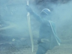 EAGLE soldiers were transporting their Freeze Beam Bazooka. For added protection, Akira and Daita, on their Machines, escorted the group. They were all unaware they were being watched. As the group traveled through a valley, above them stood Witch Mask, watching them. Witch Mask wanted to steal the bazooka and make Japan freeze. After a bit, Akira had the team stop. Akira and Daita checked the back of a truck to make sure everything was still functioning. The EAGLE soldiers, sitting in the back with the bazooka, confirmed that everything was okay. Daita and Akira returned to their Machine, and the journey continued. Witch Mask gave the order to fire. Several explosions erupted around the transport team. Several Zolders lined the top of the valley and watched the explosions. Witch Mask laughed as it jumped on it's broom and flew towards the team. The Zolders came running down the hill towards the team as well. Soon Akira, Daita, and the EAGLE soldiers were surrounded by Witch Mask and the Zolders. Daita demanded to know who they were. The reply was Witch Mask from the Black Cross Army. Witch Mask then announced that it was here to steal their Freeze Beam Bazooka. The battle began. Akira tried to fight Witch Mask, but was blocked by a Zolder. The EAGLE soldiers fought the Zolders. Akira punched a Zolder. Daita crushed the bones of another Zolder by squeezing tightly. Akira fought another Zolder but was knocked off his feet. Akira rolled down the hill. Daita hurried over to his friend and made sure he was okay. Witch Mask pointed it's broom towards the two and fire shot out of it. Witch Mask laughed as it chased them around with it's fiery broom. Akira and Daita leaped into the air and transform into Ao Ranger and Ki Ranger. Now the two Gorengers stood above Witch Mask. Witch Mask quickly got on it's broom and flew away. Ao Ranger and Ki Ranger activated their Birdies and flew after Witch Mask. They eventually caught up to Witch Mask and fought it. But they could not defeat it and Witch Mask flew away. Ao Ranger pulled out Blue Cherry and fired it. The arrow hit Witch Mask in the back and it fell to the ground as a small, black ball. Ki Ranger and Ao Ranger were confused. Witch Mask appeared to be inside the ball. Ki Ranger picked up the ball and threw it as hard as he could onto the ground. The ball bounced back and hit both Ki Ranger and Ao Ranger's helmets. The ball bounced up into the sky and Witch Mask reverted back to it's form, flying away from them. Meanwhile, the EAGLE soldiers were firing at the Zolders. Witch Mask flew down and joined in the battle. Witch Mask used it's broom to fire flames at the EAGLE soldiers. As Witch Mask kept the EAGLE soldiers busy, it directed the Zolders to get the Freeze Beam Bazooka. The EAGLE soldiers tried to protect the bazooka, but Witch Mask and the Zolders defeated the guarding EAGLE soldiers. Witch Mask used the Freeze Beam Bazooka on the EAGLE soldiers, freezing them where they stood. Witch Mask was impressed with the bazooka. Ki Ranger and Ao Ranger used the Birdies to fly back and found the defeated EAGLE soldiers. Ki Ranger lifted up one of the EAGLE soldiers and asked where the Freeze Beam Bazooka was? The EAGLE solider replies Witch...Mask...Ao Ranger suggested they follow Witch Mask and Ki Ranger agreed. On their Machine, Ao Ranger and Ki Ranger continued their pursuant. Eventually the two went in separate directions. Daita was captured. Tsuyoshi went to rescue him and was captured as well. Variblune prepares for takeoff. Akira decides to use the Blue Smoke shading strategy. Kenji and Peggy agree to the plan. They fly towards the fortress. Tsuyoshi and Daita are tied to railings outside the building. Witch Mask orders the Zolders to shoot the missile. Black Cross Army's artillery towers fire at Variblune. Variblune remains untouched and Akira laughs. Witch Mask can't believe it. Kenji, Peggy, and Akira transform and using their Birdies fly out of Variblune. Witch Mask decides if she can't destroyed all of the Gorengers, she can at least destroy the two she has. She tells the Zolders to get rid of those two. Before they can fire, a loud voice shouts wait - it is Ao Ranger. Ao Ranger lands and kicks a couple of the Zolders. Witch Mask notices that Mido Ranger and Momo Ranger are in front of Tsuyoshi and Daita. The two Gorengers quickly untie Tsuyoshi and Daita. Tsuyoshi and Daita transform into Aka Ranger and Ki Ranger. The five Gorengers gather together. Witch Mask, once more, orders the Zolders to fire at them. Ao Ranger shouts no! He pulls out his controller and has Variblune drop down it's clamp and attaches to the Freeze Beam Bazooka - which had been stolen from EAGLE. Variblune then lifts the bazooka away. The Gorengers run towards Witch Mask. Witch Mask orders the Zolders to get them! Ao Ranger kicks another set of Zolders. Momo Ranger blocks a move from Zolder. Aka Ranger lands several punches on a Zolder. Ki Ranger punches a Zolder and then tosses it aside. Aka Ranger knocks a Zolder off it's feet with his Red Vute. Mido Ranger strikes a Zolder several times. Ao Ranger outmaneuvers a Zolder, then punches it, and tosses it aside. Momo Ranger flips a Zolder. Aka Ranger uses his Red Vute to strike a Zolder. Ao Ranger uses his Blue Cherry to fire at a Zolder. Mido Ranger uses his Midomerang to strike a couple of Zolders. Ki Ranger lands several quick punches on a Zolder. Finishing off the Zolders, the Gorengers face down Witch Mask. Witch Mask uses it's broom to shoot several fire bombs at the Gorengers. The Gorengers manage to outmaneuver them all. Aka Ranger calls for Gorenger Storm. Momo Ranger turns around and a pink ball appears in her hands. She places the pink ball on the ground and kicks it over to Ki Ranger. When it reaches Ki Ranger, the ball has turned yellow. Ki Ranger head butts the ball towards Ko Ranger. On the way to Ko Ranger, the ball turns blue. Ao Ranger kicks the ball over to Mido Ranger. Once more the ball changes