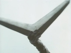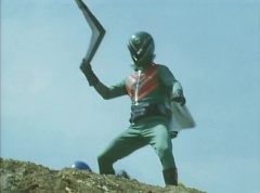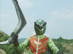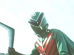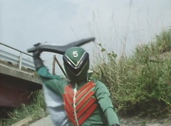 The Gorengers were battling Samurai Mask and several Zolders. Samurai Mask is furious. The Gorengers jump into the valley and quickly surround Samurai Mask. Samurai Mask angrily asks, who are you?! Aka Ranger responds, Aka Ranger! The rest of the Gorengers also respond with their names, Ao Ranger, Ki Ranger, Momo Ranger, and Mido Ranger! Aka Ranger states, the five of us, together are...GORENGER!! Samurai Mask leaps forward and Ao Ranger stops him. More Zolders arrive. Aka Ranger uses his Red Vute to battle the Zolders. The Red Vute wraps around a Zolder's neck and Aka Ranger flips the Zolder to the ground. Aka Ranger uses his Red Vute against another Zolder. When it's wrapped around the neck of the Zolder, Aka Ranger calls out to Mido Ranger. Mido Ranger gets his Midomerang ready. When Aka Ranger flings the Zolder, Mido Ranger throws his Midomerang towards the Zolder. It hits the Zolder and knocks it off the cliff. Ki Ranger uses his impressive strength and Judo moves to defeat the Zolders he is fighting against. Momo Ranger lands several chops against a Zolder and then a powerful kick. Ao Ranger is fighting several Zolders as Samurai Mask approaches him. Aka Ranger flips over to where Ao Ranger is. Aka Ranger and Ao Ranger fight Samurai Mask. Aka Ranger lands a kick that knocks Samurai Mask down the hill. Two Zolders race over to the Sand Beam as Samurai Mask tries to outrun Ao Ranger and Mido Ranger. Momo Ranger uses her Earrings Bomb and throws it at the Zolders by the Sand Beam, causing the Zolders to blow up. Aka Ranger fights another group of Zolders. Aka Ranger lands several chops against a Zolder and then flips him over. Momo Ranger lands a powerful kick on another Zolder. Ao Ranger lands a powerful kick on a Zolder. Ki Ranger flips over a Zolder as Mido Ranger fights another group of Zolders. On top of the hill, Ao Ranger is fighting Samurai Mask. Aka Ranger calls out to Ao Ranger, and Ao Ranger flips over to where Aka Ranger and Mido Ranger are standing. Momo Ranger and Ki Ranger leap over to the rest of the Gorengers. They get ready for the Gorenger Storm attack. Momo Ranger swirls around and a silver ball appears in her hands. She throws it to Mido Ranger, who throws it to Ki Ranger, who throws it to Ao Ranger. Ao Ranger throws it high in the air for Aka Ranger. Aka Ranger leaps up into the air and kicks the ball towards Samurai Mask. Gorenger Storm hits Samurai Mask. In the smoke, Samurai Mask tells the Gorengers they have not beaten him yet. I'll create a desert for you from space! Farewell! The ground begins to shake and a missile appears from underneath the ground. Aka Ranger tells the rest, the missile has the Sand Beam device on it. Momo Ranger pulls out an Earring bomb, and tells Ao Ranger to use it. The missile launches into the sky. Ao Ranger fixes the bomb onto one of his arrows, uses his Blue Cherry and fires at the missile. It hits the missile and destroys it and Samurai Mask.
