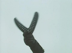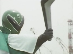Kenji Asuka, Peggy Matsuyama, and Tsuyoshi Kaijo were escorting Professor Kudo. Boat Ear Mask wanted to kidnap Professor Kudo and drain his memory in order to learn how to produce an antimatter bomb. On their journey, Boat Ear Mask had stopped the vehicles and had his Zolders attacked. Boat Ear Mask was surprised to discover Professor Kudo was not with Peggy and Tsuyoshi. Instead, some distance away, Kenji drives his Machine with Professor Kudo in the sidecar. After some time, both are knocked off the road by a large boulder. Kenji hurts his arm in the fall. Professor Kudo is hurt as well and Kenji helps him to the road, where Kenji flags down a car on the road. After Kenji helps Professor Kudo into the car, the driver reveals himself to be a Zolder and drives away. Mido Ranger makes another rescue attempt, but is unable to due to his arm injury. Kenji returns back to the Gorenger Base and works on his Midomerang. He gets very excited when he finishes. Kenji tests his weapon and it is in fine form. Kenji is determined to strike Boat Ear Mask this time. Mido Ranger heads out. Elsewhere, Aka Ranger, Momo Ranger, Ao Ranger, and Ki Ranger face down Boat Ear Mask. Boat Ear Mask quickly taunts them that their 5th member didn't show up and laughs. Mido Ranger shouts, turn around! The five Gorengers face down Boat Ear Mask. Boat Ear Mask summons the Zolders and has them attack. Momo Ranger fights a Zolder with quick moves. Ki Ranger lands a powerful chop against a Zolder. Aka Ranger lands several punches against a Zolder. Mido Ranger fights a Zolder using his Midomerang against it. Mido Ranger struggles a little with his injured arm. Ao Ranger lands a kick against a Zolder. Ki Ranger head butts a Zolder and then tosses it. Mido Ranger uses his Midomerang against the same Zolder and knocks it out. Aka Ranger uses his Red Vute against several Zolders. Momo Ranger fights a pair of Zolders and knocks them aside. She takes her Earrings Bomb and tosses them towards a group of Zolders racing towards her. Ao Ranger uses his Blue Cherry and shoots a Zolder above him. Mido Ranger fights three Zolders using his Midomerang. After defeating them, Mido Ranger challenges Boat Ear Mask. Boat Ear Mask responds by telling him, come at me! Boat Ear Mask uses his reverse strike but misses Mido Ranger. Boat Ear Mask releases his ribbon but Mido Ranger cuts it with his Midomerang. Mido Ranger tells Boat Ear Mask, he is going to get his ears next. Mido Ranger leaps high into the air and lands close to Boat Ear Mask. Mido Ranger uses his Midomerang and cuts off Boat Ear Mask's ears. The ears land on the ground and then reassemble onto Boat Ear Mask's weapon. Boat Ear Mask fights Mido Ranger with his weapon. Mido Ranger leaps out of the way and lands close to the rest of the Gorengers. The Gorengers summon Gorenger Storm. Boat Ear Mask runs towards them with his weapon. Momo Ranger has a pink ball and kicks it towards Ki Ranger. Ki Ranger head butts the yellow ball towards Ao Ranger. Ao Ranger kicks the blue ball over to Mido Ranger. Mido Ranger kicks the green ball over to Aka Ranger. The ball turns red and spikey on it's way towards Aka Ranger. Aka Ranger leaps up and kicks the ball towards Boat Ear Mask. Gorenger Storm strikes and destroys Boat Ear Mask.