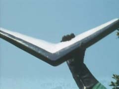 The Gorengers had been notified that EAGLE Agent 0010 had obtained the Hurricane Diode from Wing Mask. Aka Ranger, on his Machine, along with Mido Ranger and Momo Ranger, ,on their Machine, were on the way. Unfortunately Wing Mask had gotten the Hurricane Diode back from EAGLE Agent 0010, by causing his car to crash and knocking him unconscious. The three Gorengers arrive at the accident. Wing Mask and his Zolders are still there. Wing Mask has the Zolders attack. Aka Ranger leaps into the air and strikes a Zolder with his Red Vute. Mido Ranger fights another Zolder. He strikes the Zolder several times. Momo Ranger is fighting another group of Zolders. She lands a hard kick on one of the Zolders. Aka Ranger battles yet another set of Zolders with his Red Vute. Momo Ranger uses her Earrings Bomb and tosses it towards another group of Zolders. Wing Mask throws his Condor Wing towards the three Gorengers. Mido Ranger throws his Midomerang to strike Condor Wing. Aka Ranger fights another Zolder using his Red Vute to strike the Zolder several times. Wing Mask grabs Yuki, a young girl that was close by, and tells the Gorengers, don't move. The three Gorengers stop fighting the Zolders and watch as Wing Mask leaves with Yuki. As Wing Mask is driven away, he uses his weapon to fire at the three Gorengers running after them. Afterwards, Kenji, Peggy, and Tsuyoshi come up with a plan. The plan is put into operation. Yuki is saved but Peggy has been captured. When Mido Ranger and Aka Ranger arrive, Peggy is tied to a steel tower and struck several times by Wing Mask. Mido Ranger and Aka Ranger immediately leap into action. Aka Ranger fights Wing Mask as Mido Ranger fights the Zolders. Mido Ranger uses his Midomerang to cut through Peggy's binds, freeing her. Peggy joins in the fighting, giving a kick to a Zolder. She uses the steel tower to kick another Zolder. Peggy then transforms into Momo Ranger. Momo Ranger fights another Zolder. Aka Ranger joins in the fight against the Zolders. Aka Ranger punches a Zolder several times. After defeating the Zolder, Aka Ranger faces down Wing Mask. Behind him stands Momo Ranger and Mido Ranger. Wing Mask tries to strike Momo Ranger with his staff/weapon but is blocked. Wing Mask tries again and this time he is stopped by Aka Ranger. Aka Ranger grabs onto the staff/weapon until Wing Mask yanks it out of Aka Ranger's hand. Wing Mask tries to strike Aka Ranger with his staff/weapon but Aka Ranger blocks the blow. Aka Ranger lands a kick and Wing Mask makes his getaway. The three Gorengers are tricked and end up trapped in a cell. Ao Ranger and Ki Ranger arrive and rescue them from the cell. The explosion rocks the lighthouse. Seeing the explosion, Wing Mask is ready to start his hurricane plan. Before Wing Mask can do anything a voice yells at them from above. It's Aka Ranger, along with Mido Ranger, Ao Ranger, Ki Ranger, and Momo Ranger. Wing Mask is not happy to see the Gorengers. Wing Mask commands the Zolders to attack. The Gorengers and Zolders fight. Aka Ranger uses his Red Vute against a Zolder. Mido Ranger kicks a Zolder aside. Ki Ranger tosses a Zolder. Ao Ranger strikes a Zolder with his Blue Cherry. Ki Ranger lifts a Zolder into the sky as Ao Ranger takes aim at it with his Blue Cherry and hits it out of the sky. Ki Ranger strikes a Zolder and then tosses it aside. Mido Ranger lands several chops on a Zolder. Aka Ranger strikes another Zolder with his Red Vute. Momo Ranger flips a Zolder onto the ground. Then she releases her Earrings Bomb on a pair of Zolders. Aka Ranger uses his Red Vute to fight three Zolders. Mido Ranger throws his Midomerang towards a Zolder and knocks it to the ground. Momo Ranger fights another Zolder. She lands several punches on the Zolder and then shoves the Zolder aside. Ao Ranger fires his Blue Cherry at another Zolder. The Zolders are defeated. Aka Ranger tells Ao Ranger get the diode with Blue Cherry. Ao Ranger aims Blue Cherry towards Wing Mask. Wing Mask tells him if he shoots that arrow, the girl will die. Behind Wing Mask is a Zolder holding Yuki. Ao Ranger lowers Blue Cherry as the rest of the Gorengers gather around him. Wing Mask tells them the balloons Yuki is holding is filled with explosives. Wing Mask laughs as he turns on the Hurricane Diode. Strong Winds immediately hit the Gorengers. The Gorengers struggle to keep their footing. Aka Ranger notices that Yuki's balloons are not moving. Aka Ranger concludes that Yuki's balloons are the eye of the storm. Aka Ranger activates Birdie. Aka Ranger flies high into the sky. Aka Ranger lands in the eye of the storm. Aka Ranger strikes the Zolder who is holding Yuki with his Red Vute and the Zolder falls to the ground. Yuki accidentally lets go of her balloons. After some distance, the balloons explode. Wing Mask is furious. Aka Ranger wraps Wing Mask in his Red Vute and throws him quite a distance. Wing Mask gets up as Momo Ranger leaps down and removes Hurricane Diode from Wing Mask. Wing Mask tries to strike Momo Ranger but instead finds himself tossed by Momo Ranger. Wing Mask throws his Condor Wing towards Momo Ranger. Mido Ranger stops Condor Wing with his Midomerang. Condor Wing returns to Wing Mask and he uses it to fire at the Gorengers. The Gorengers easily outmaneuver his explosions. The Gorengers prepare to use Gorenger Storm. Momo Ranger turns around and a pink ball appears in her hands. She places it on the ground and kicks it to Ki Ranger. The ball turns yellow and Ki Ranger hits it with his head towards Mido Ranger. The ball turns green and Mido Ranger kicks it over to Ao Ranger. The ball turns blue and Ao Ranger kicks it over to Aka Ranger. The ball turns red and spikey as Aka Ranger leaps into the sky and kicks it over to Wing Mask. Gorenger Storm hits Wing Mask and destroys him.
